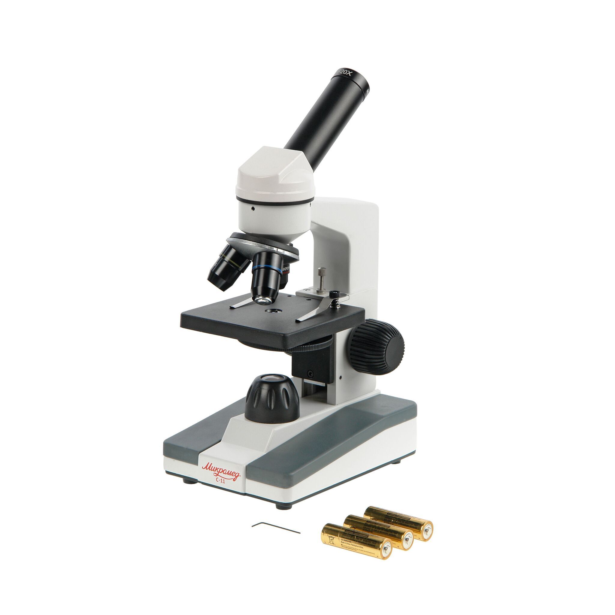 Осветитель снабжен коллекторной линзой, что повышает равномерность и яркость освещения предмета исследования. Питание микроскопа производится от 3-х щелочных батареек типа АА или от сетевого адаптера 5В. При необходимости, адаптер питания может быть приобретен дополнительно. Возможность питания микроскопа от батарей позволяет пользоваться микроскопом не только в учебном классе или дома, но и в любых ситуациях, когда электросеть недоступна.