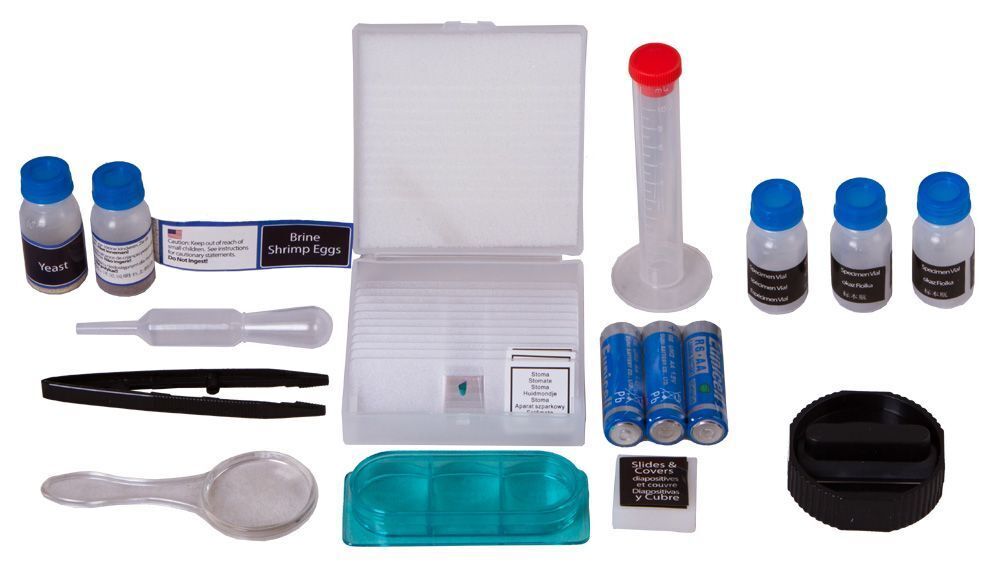 В комплекте с микроскопом идет большой набор для проведения опытов. В коробке вы найдете готовые микропрепараты, флаконы с образцами, предметные и покровные стекла, инструменты юного биолога. Приступить к исследованиям можно будет прямо после вскрытия коробки! А уже через несколько дней выращенная самостоятельно артемия станет предметом гордости маленького ученого.