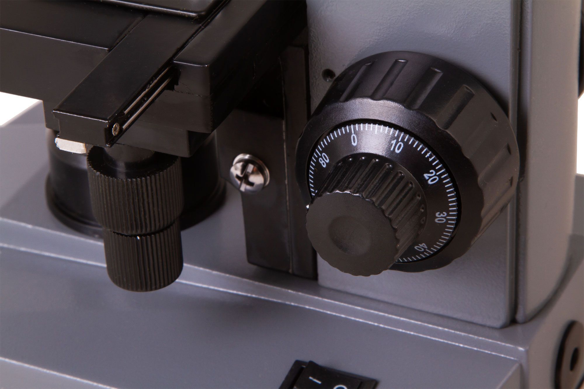 Микропрепараты фиксируются на предметном столике. Его можно перемещать по двум направлениям, а для максимально точного позиционирования образцов под объективом используется препаратоводитель. Для настройки резкости применяется коаксиальный механизм грубой и точной фокусировки.