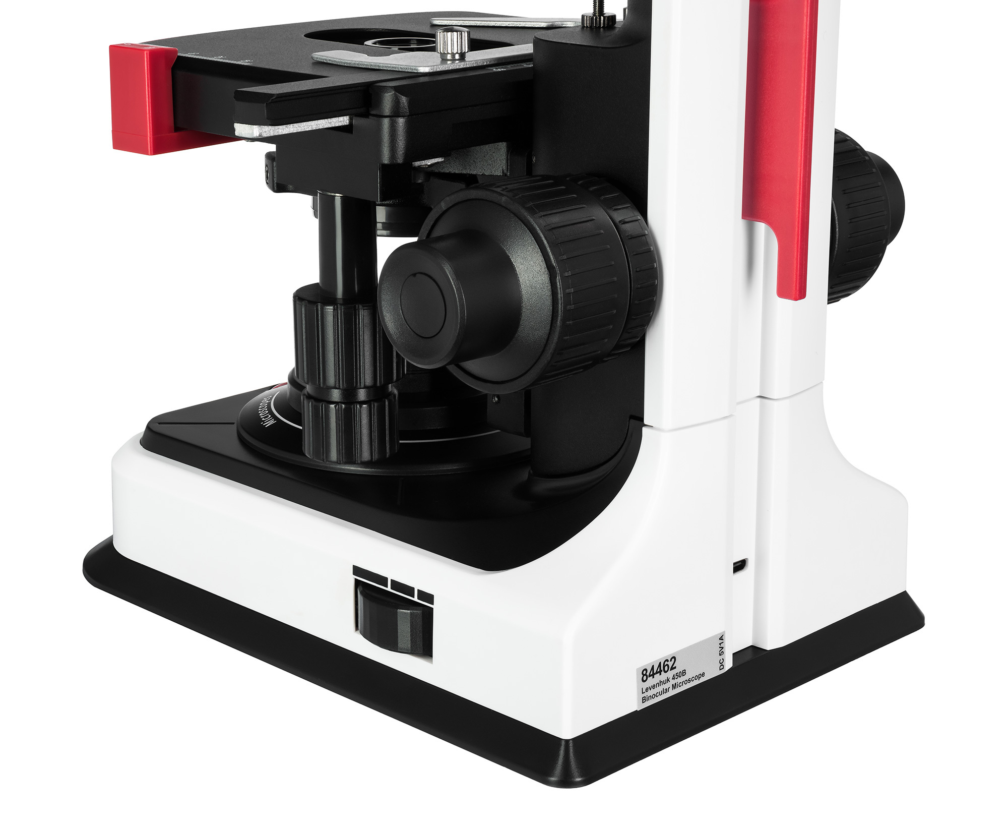 В конструкции микроскопа Levenhuk 450B предусмотрен предметный столик 110x120 мм, под которым находятся подсветка – светодиод с коллектором – и конденсор Аббе с ирисовой диафрагмой и специальным держателем для светофильтра. Конденсор усиливает интенсивность и корректирует направление света, благодаря чему исследуемый образец подсвечивается равномерно и может быть изучен в деталях.