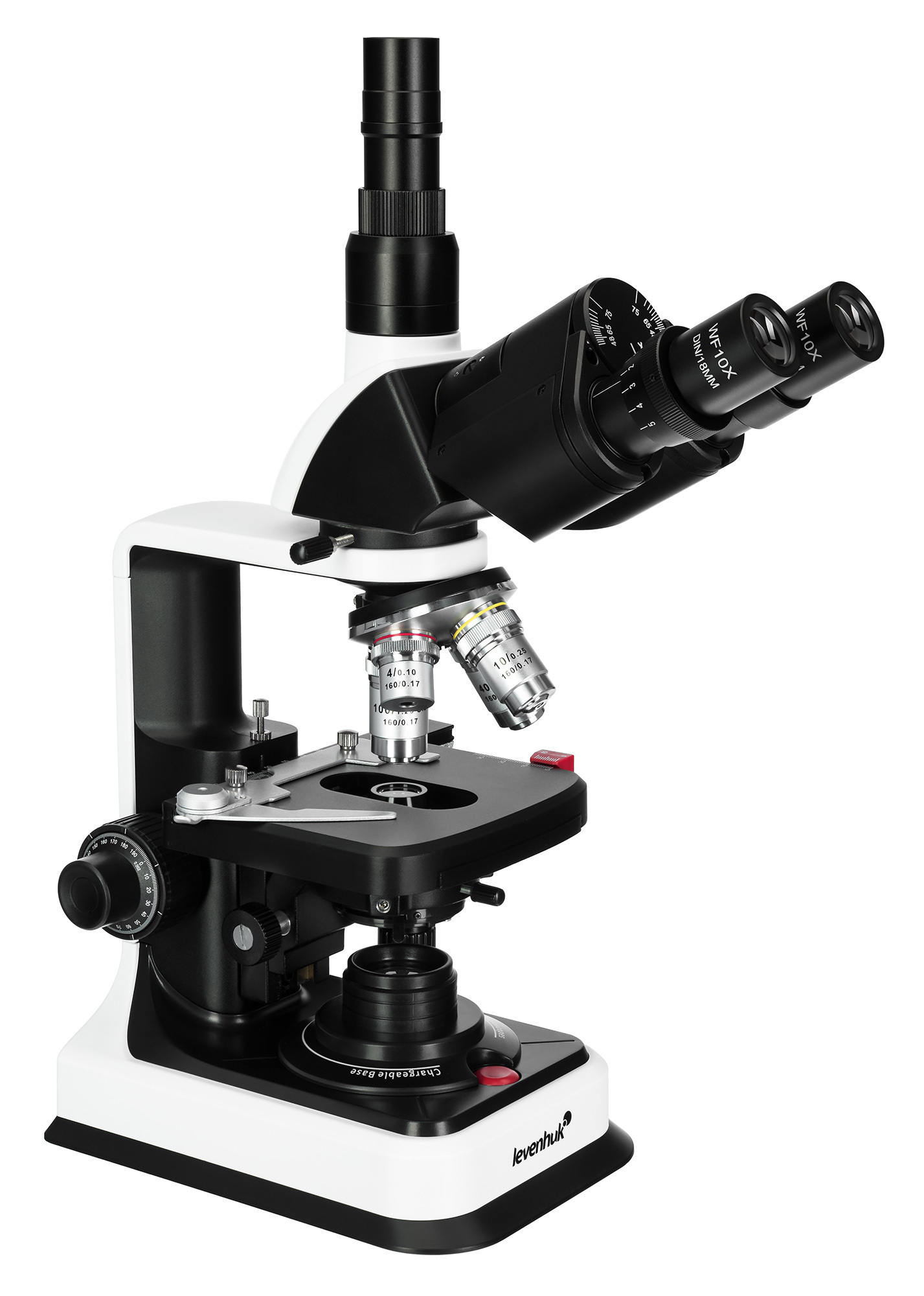 В револьверном устройстве микроскопа Levenhuk 450T расположены 4 ахроматических объектива кратностью 4х, 10x, 40х и 100х, формирующих четкое, яркое и правдивое изображение в любых условиях наблюдений. Объективы на 40 и 100 крат имеют защитные пружинящие оправы, а последний объектив также можно использовать для наблюдений по методу масляной иммерсии (флакон с иммерсионным маслом входит в комплект).