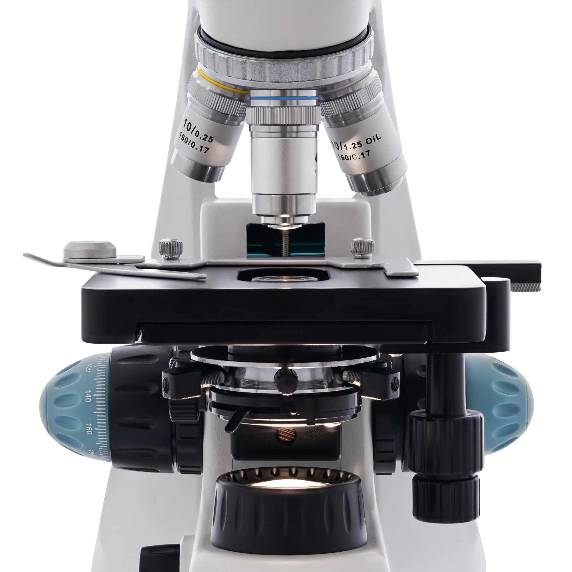 Насадка состоит из бинокулярного визуального блока (он имеет небольшой наклон в 30°) и отдельно расположенной вертикальной трубки (в нее можно установить цифровую камеру). Насадка вращается, что делает работу в лаборатории более удобной. Окуляры широкопольные и дают увеличение в 10 крат. Ахроматические объективы уже установлены в револьверное устройство. 40-кратный и 100-кратный объективы имеют защиту передней линзы – специальную пружинящую оправу. 100-кратный объектив используется для масляной иммерсии. Оптическая схема микроскопа позволяет проводить исследования на увеличении от 40 до 1000 крат. Для настройки резкости применяется коаксиальный механизм грубой и точной фокусировки.
