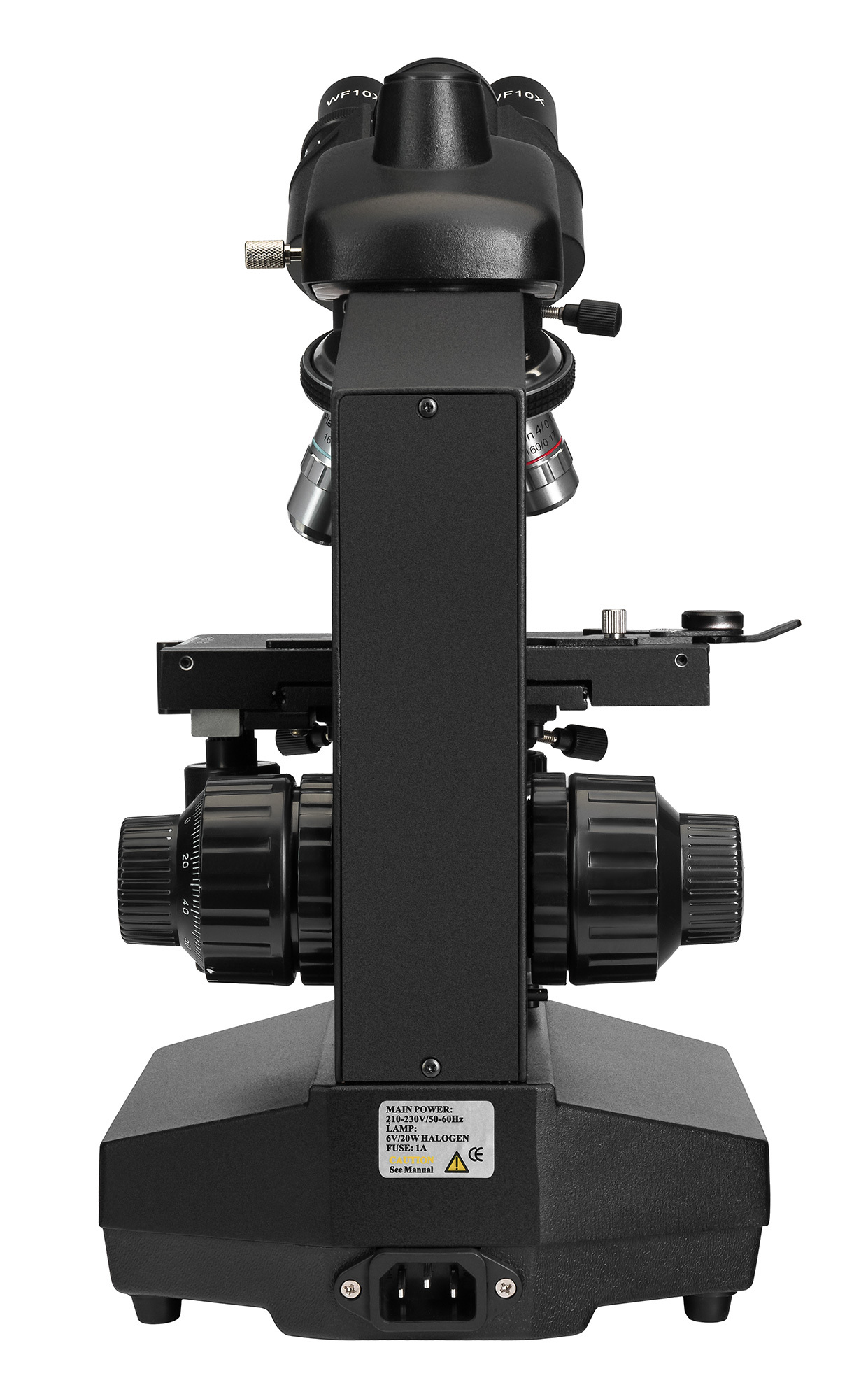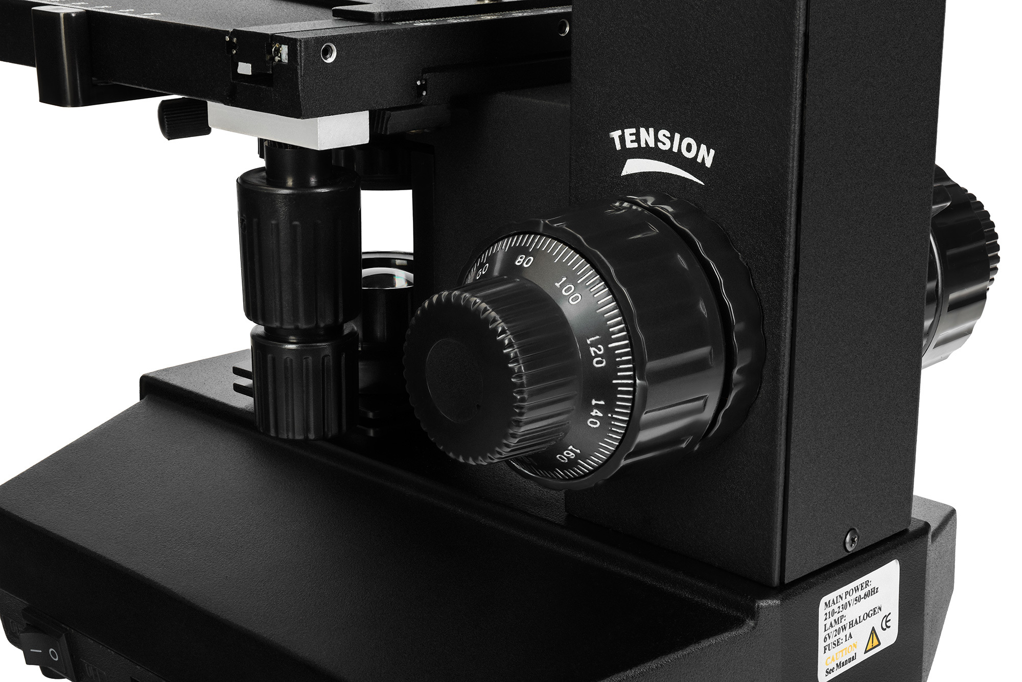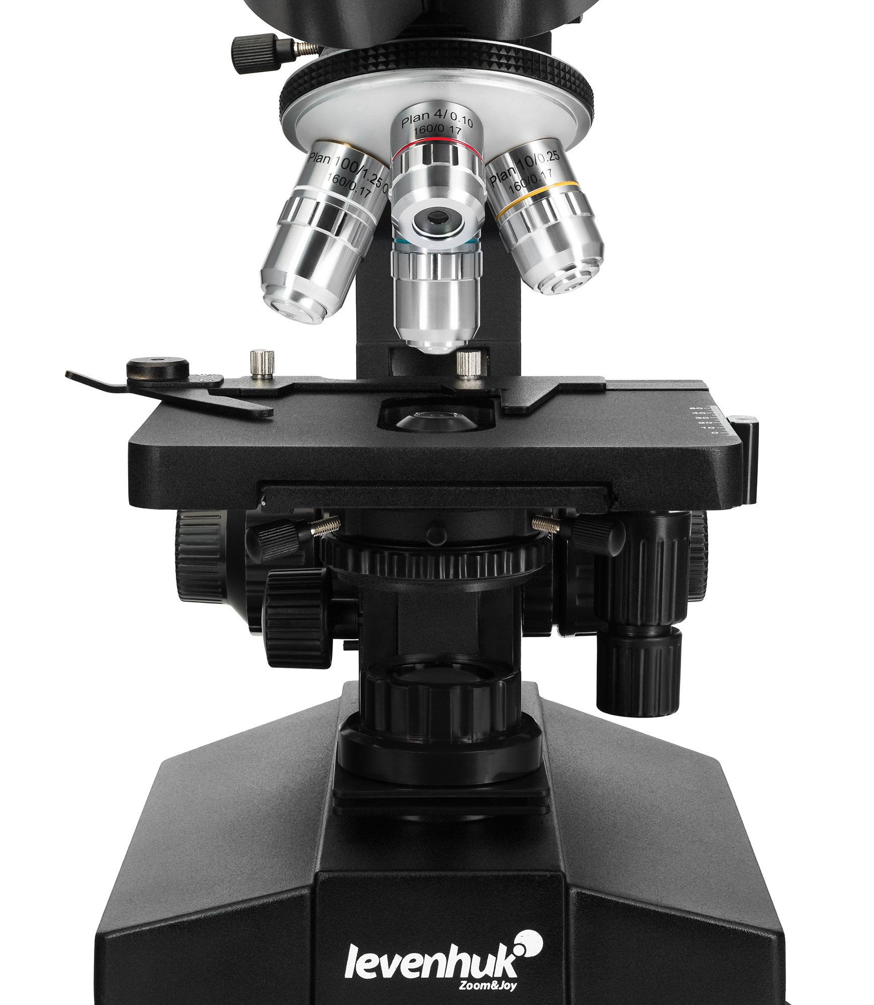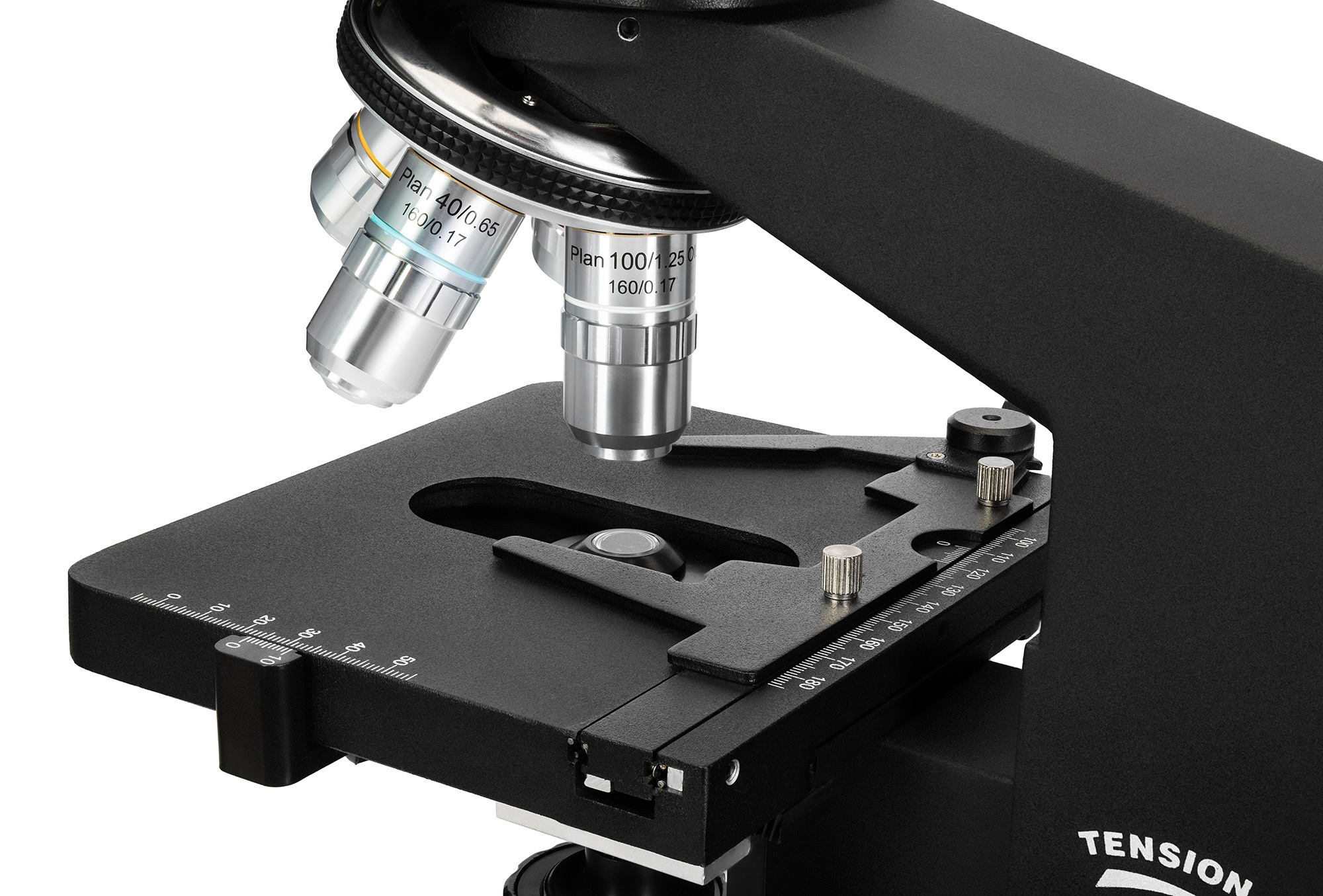Для установки объективов в револьверном устройстве предусмотрены четыре гнезда, столько же объективов включено в базовую комплектацию. Линзы объективов 40х и 100х защищены пружинящими оправами, делающими работу на большой кратности более безопасной – случайное неудачное движение при фокусировке не повредит их оптику. Объектив 100х рассчитан на работу с иммерсионным маслом, но может использоваться и без него. Объективы малой кратности в комплекте – это 4х и 10x. Все объективы являются планахроматами, формирующими четкое и детализированное изображение с минимумом аберраций. Фокусировка может выполняться как грубо, так и тонко – рукоятки настройки расположены коаксиально с двух сторон штатива.
