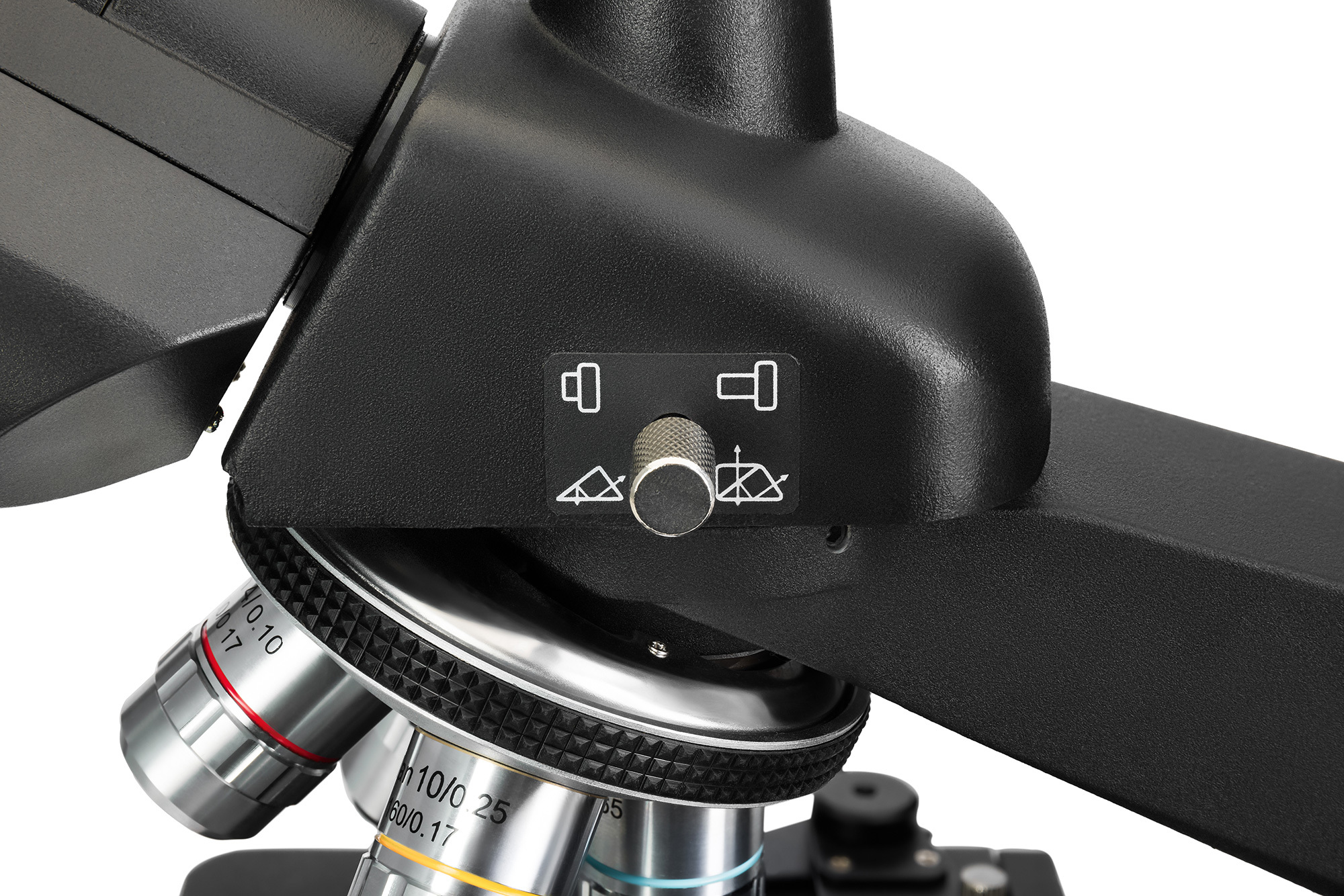 Микроскоп оснащен тринокулярной насадкой, ее конструкция предусматривает установку цифровой камеры в вертикальный канал визуализации. Сама камера в комплект не входит – ее можно выбрать самостоятельно в соответствии с решаемыми задачами. Адаптер C-mount, используемый для закрепления камеры на микроскопе, в комплектацию включен. Окулярная часть, используемая для непосредственных визуальных наблюдений, наклонена под углом 30°, чтобы длительные наблюдения не приводили к переутомлению мышц. В комплекте два парных комплекта окуляров: один обеспечивает увеличение 10x, второй – 20х. Расстояние между окулярными трубками регулируется.