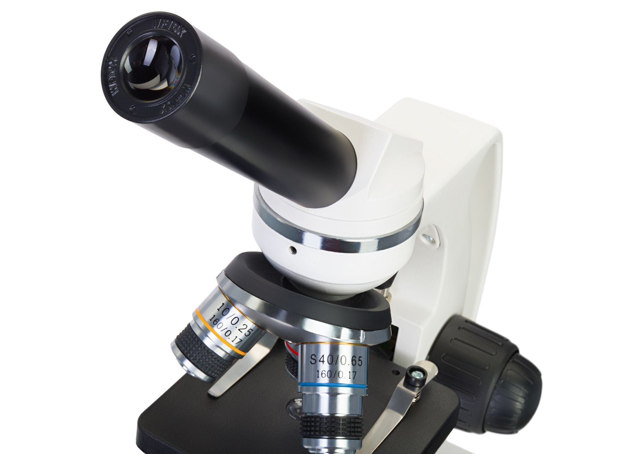 Ахроматическая оптика позволяет видеть образцы четко и с хорошей детализацией. Револьверное устройство вмещает три объектива: 4х, 10х и 40х, причем 40-кратный объектив подпружинен. Комплектный широкопольный окуляр обеспечивает хороший обзор и дает увеличение 10 крат. Монокулярная насадка отклонена на угол в 45°, что повышает комфорт длительных наблюдений. Также ее можно поворачивать на 360° в горизонтальной плоскости, что удобно при групповых исследованиях. Чтобы показать образец другому исследователю, не нужно перемещать микроскоп целиком, достаточно повернуть насадку. Отметим, что микроскоп оборудован не только грубой, но и точной фокусировкой, которая делает настройку резкости гораздо более плавной.