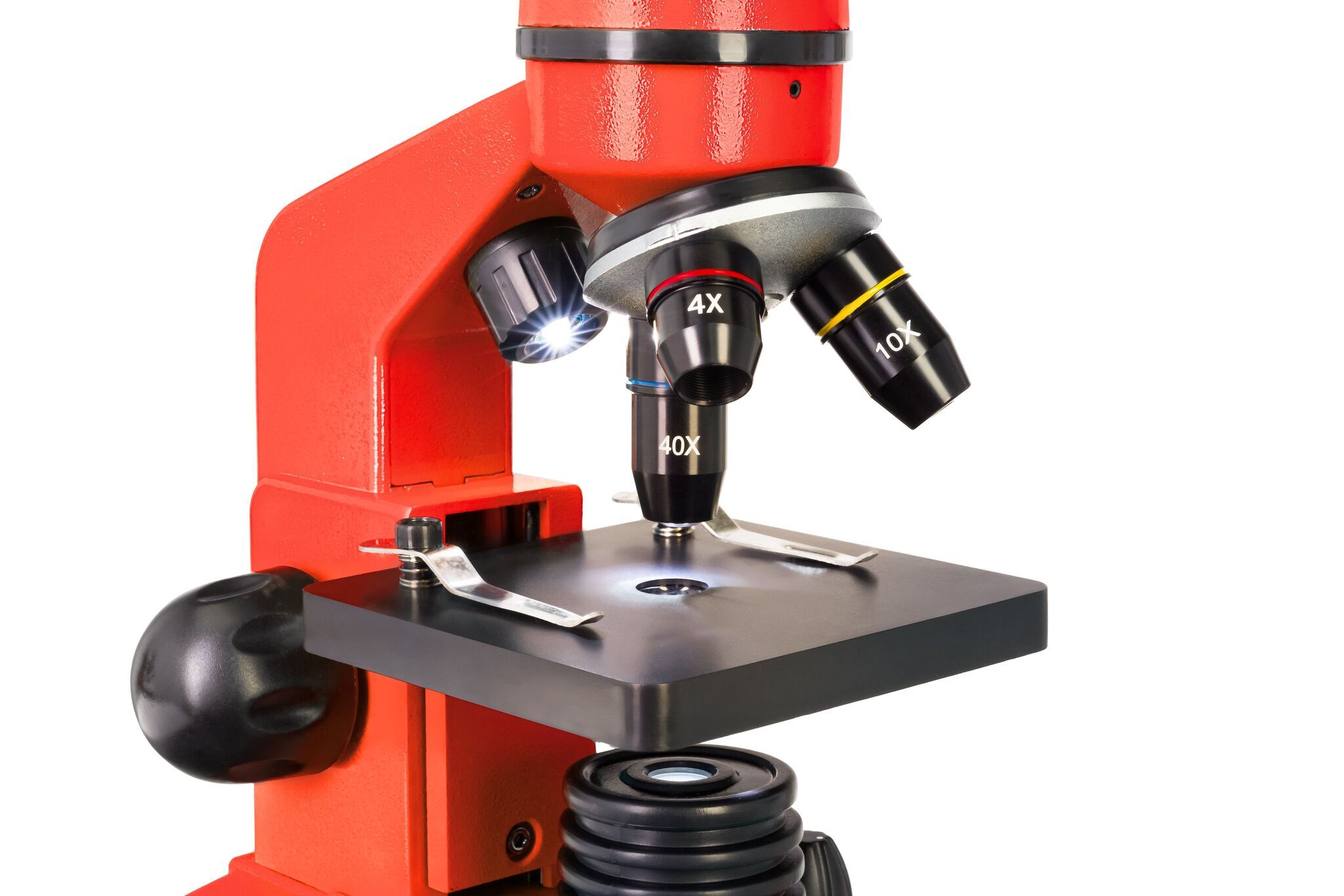 Линзы из качественного оптического стекла отличаются высокой прозрачностью, так что картинка не искажается. Многослойное просветляющее покрытие повышает светопропускание оптики и улучшает качество изображения. Микроскоп снабжен тремя объективами, с которыми можно получить увеличения 40 крат, 100 крат и 400 крат. Для смены кратности нужно просто повернуть револьверное устройство.