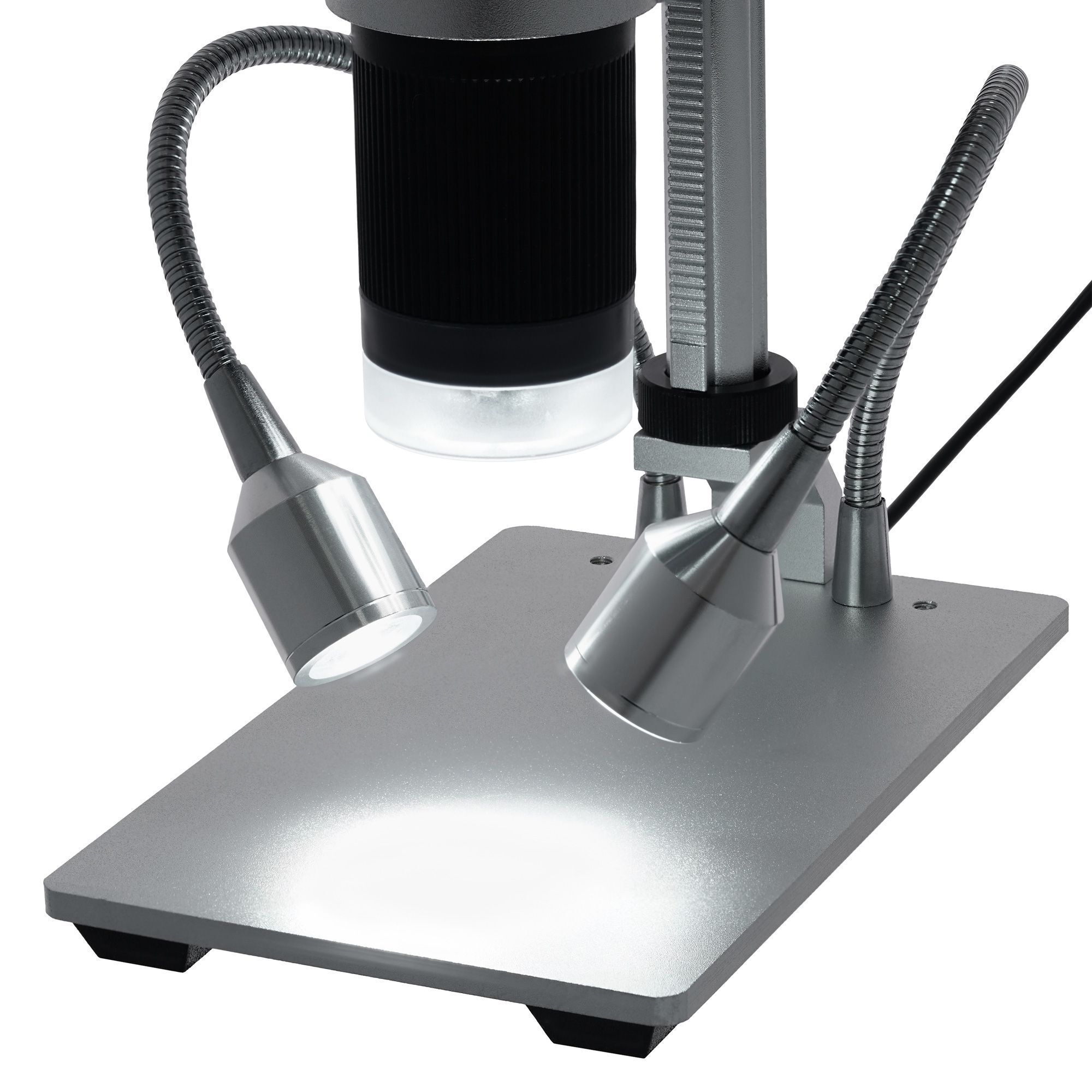 Интересным образом устроена подсветка. Несколько светодиодов находятся внутри объектива – это классическое верхнее освещение для наблюдений в отраженном свете. Также рядом расположены два светодиода на гибких держателях, которые можно отклонять под разными углами и более точно выстраивать освещение рабочей области. Яркость подсветки регулируется.
