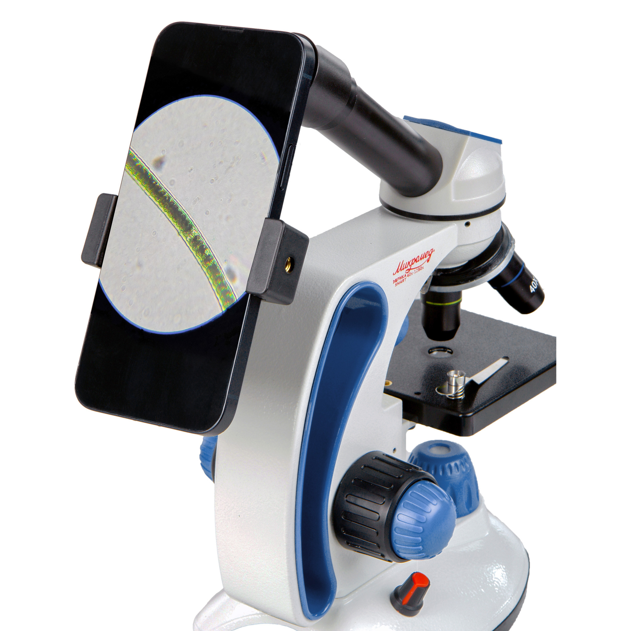 В комплекте микроскопа имеется специальный держатель для смартфона. Это позволяет исследователю записывать необходимые изображения и видео, не отрываясь от процесса исследований.