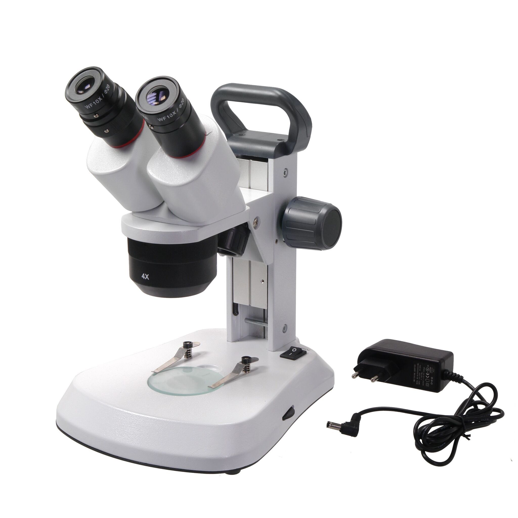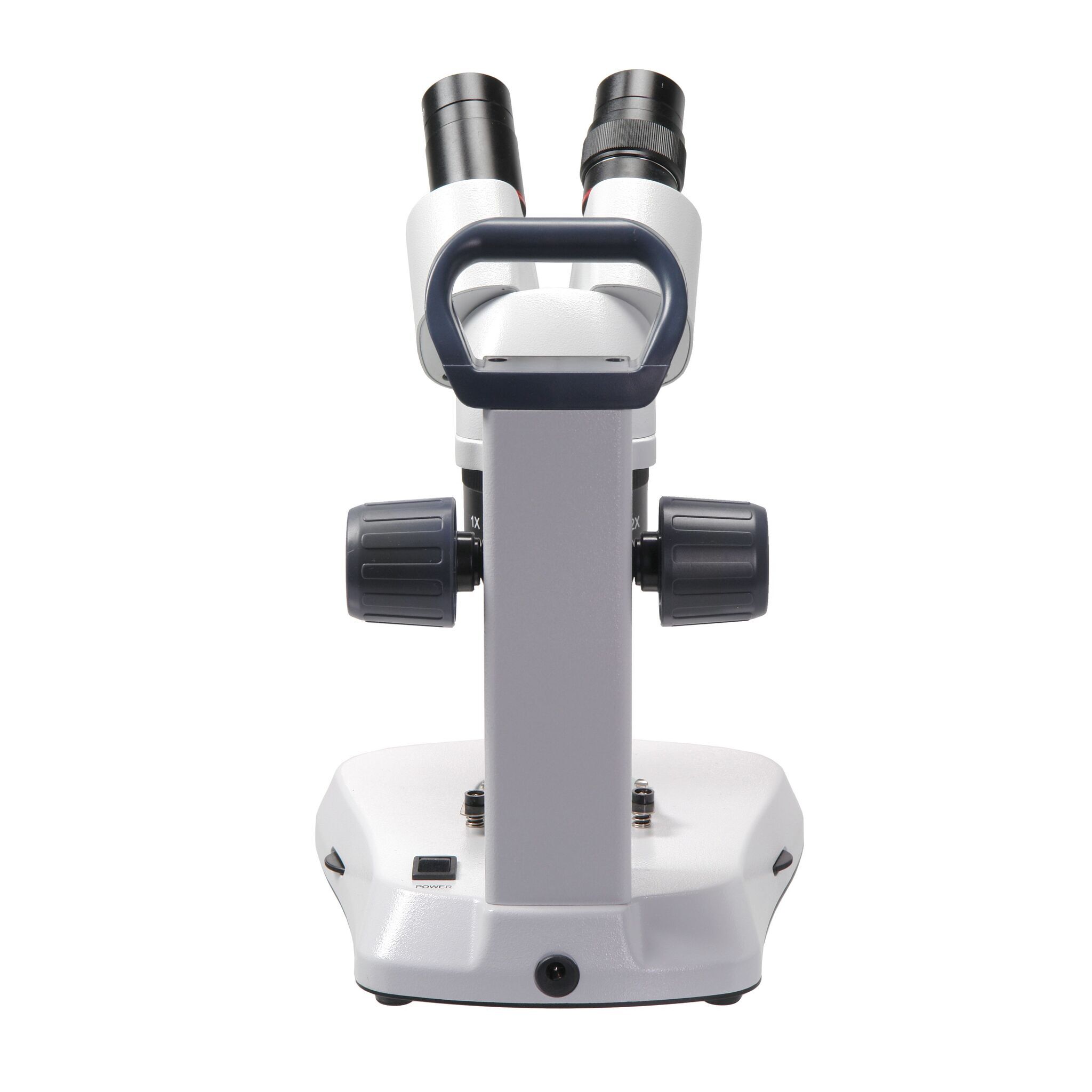 Стереомикроскоп предназначен для проведения исследований в отраженном и проходящем свете с помощью встроенных в его конструкцию осветителей на светодиодах. За счет использования светодиодов достигается малое потребление тока, что позволяет использовать для питания осветителей батарейки или аккумуляторы. Благодаря этому можно проводить наблюдения на открытом воздухе. Для питания от сети 220/230 В предназначен сетевой адаптер входящий в комплект к микроскопу. Блок питания осветителей встроен в основание микроскопа. При необходимости использовать дополнительный осветитель, его можно выбрать из ассортимента дополнительных принадлежностей.