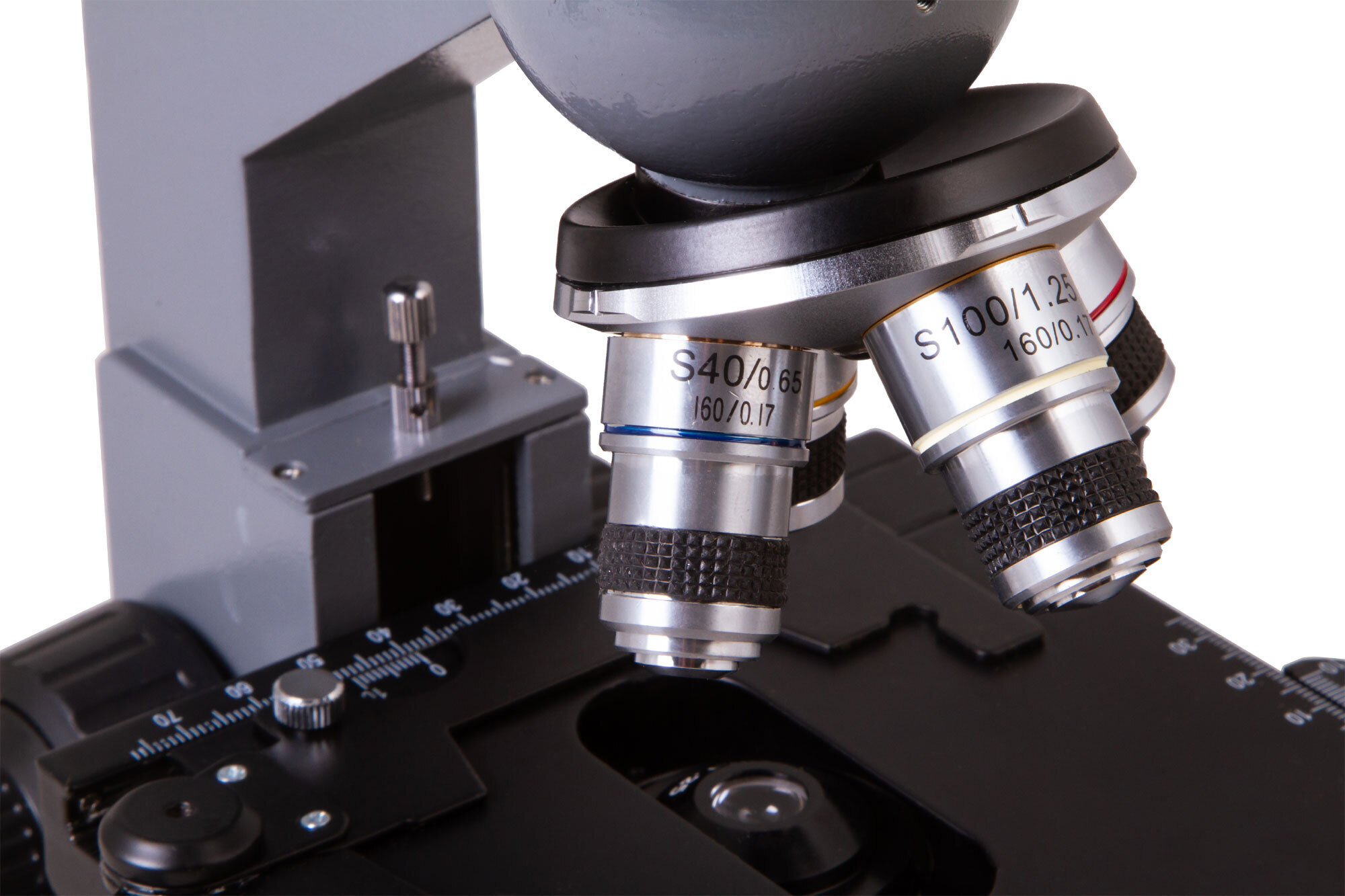 Диапазон увеличений микроскопа составляет от 40 до 1600 крат. Ахроматические объективы передают четкое и высокодетализированное изображение без искажений. На максимальном увеличении – при использовании 100-кратного объектива – можно применять метод масляной иммерсии (флакон со специальным маслом уже включен в комплект поставки). Два широкоугольных окуляра с указателем центра поля помогают изучать протяженные образцы со сложной структурой.