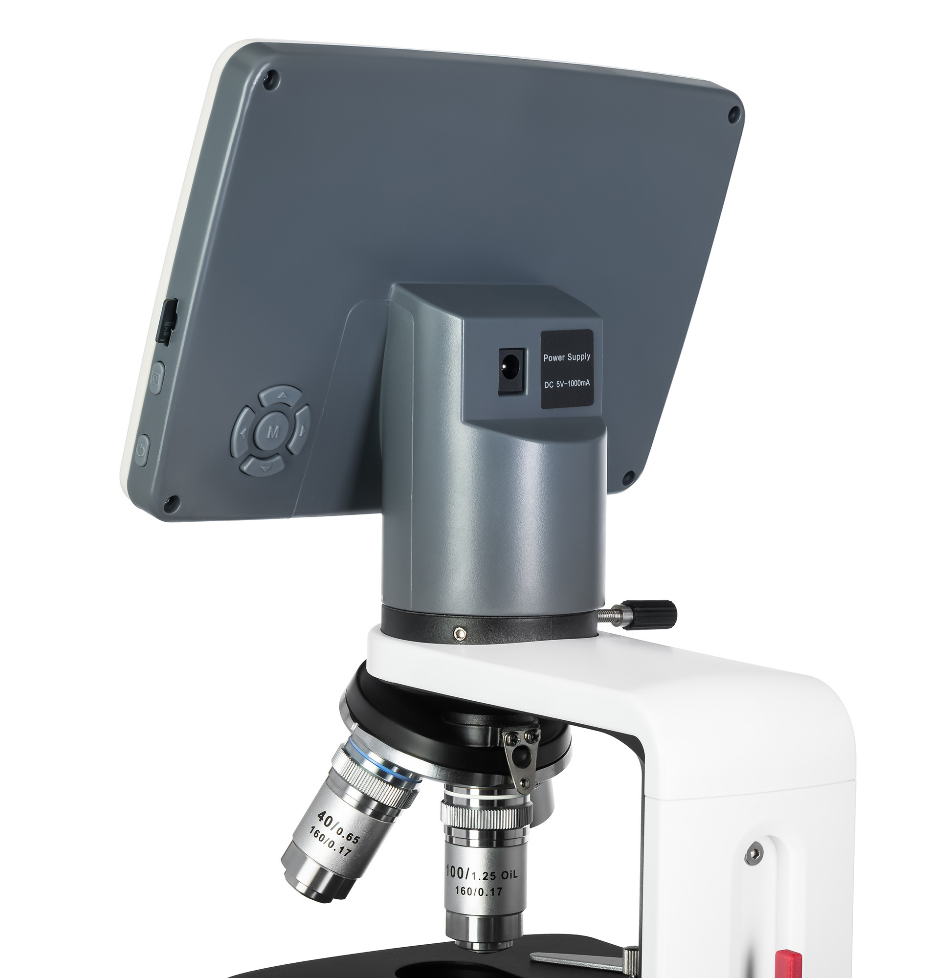 Микроскоп Levenhuk D450L не имеет классической визуальной насадки – вместо нее он оснащен ярким LCD-экраном с диагональю 7 дюймов. Такое устройство позволяет проводить длительные исследования образцов с максимальным комфортом для шеи и глаз как в индивидуальной, так и в коллективной работе. В револьверном устройстве микроскопа установлены 4 ахроматических объектива – 4, 10, 40, 100 крат, формирующих чистое изображение, лишенное искажений, аберраций и виньеток вне зависимости от условий наблюдения. Объектив 100х подходит для масляной иммерсии, и также, как и объектив 40х, оснащен защитной пружинящей оправой.