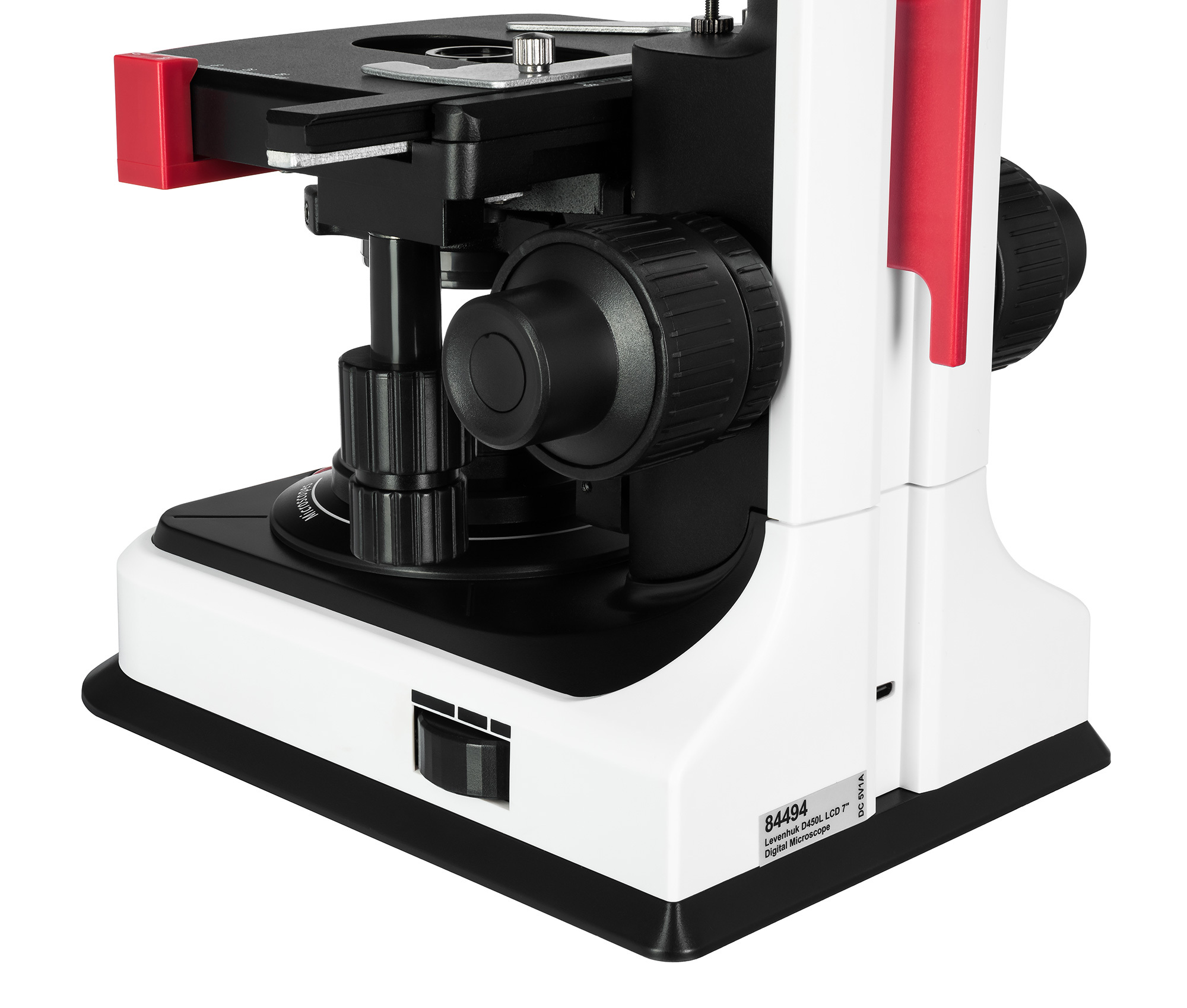 Нижняя часть микроскопа состоит из светодиодной подсветки с коллектором и функцией настройки яркости, предметного столика, конденсора Аббе с ирисовой диафрагмой и держателем для фильтра. Для фокусировки прибора с обеих сторон корпуса коаксиально расположены рукоятки грубой и точной настройки.