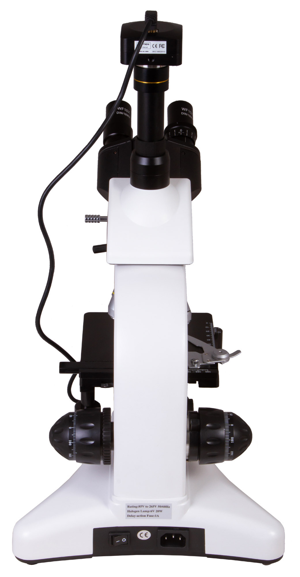 В микроскопе установлена тринокулярная насадка с делителем светового потока. Бинокулярная визуальная часть имеет удобный наклон в 30°, третья окулярная трубка для цифровой камеры – вертикальная. Такая конструкция насадки позволяет одновременно вести наблюдения обычным образом и использовать камеру для передачи изображения на внешний экран, фото- и видеозаписи. Удобство насадки еще и в том, что ее можно поворачивать на 360°.