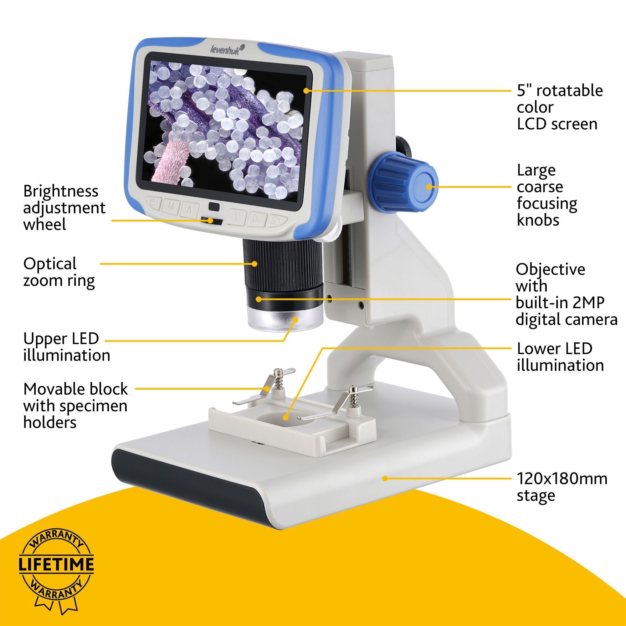 Прибор обеспечивает увеличение в диапазоне от 7 до 200 крат, картинка выводится на встроенный ЖК-экран с диагональю 5 дюймов (12,7 см). Экран передает цветное изображение и может быть отклонен на небольшой угол для более удобной работы. Кнопки управления микроскопом находятся прямо под экраном, но в комплекте есть также и беспроводной пульт дистанционного управления. На него вынесены не все функции, но с его помощью можно запускать запись видео, фотографировать и регулировать увеличение.