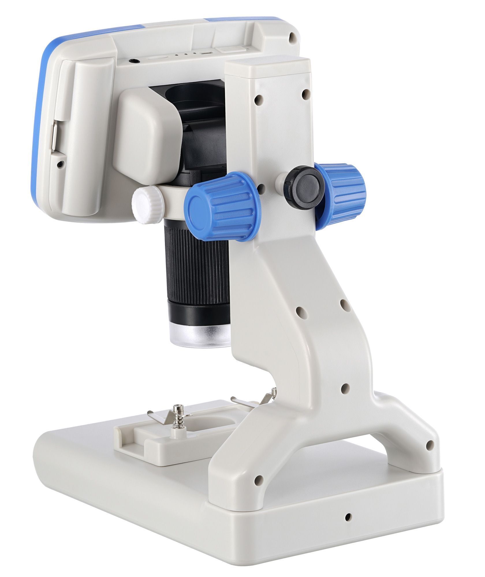 Микропрепараты на предметном столике закрепляются зажимами. Для освещения используются верхняя и нижняя светодиодная подсветки с регулировкой яркости. Подсветка может работать от аккумулятора, что делает прибор более мобильным.