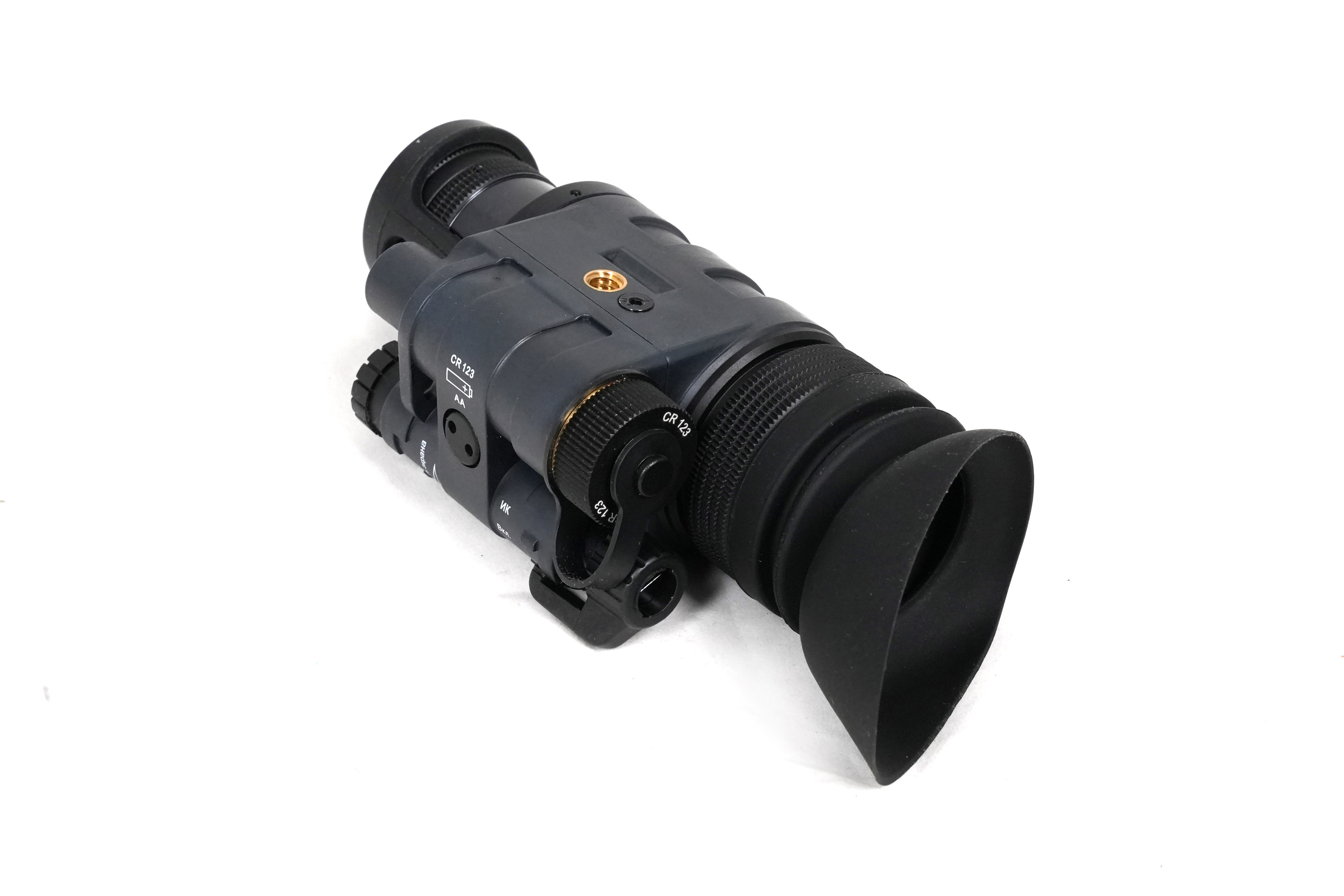 Ночной тактический монокуляр оснащен встроенным ИК-осветителем, работающим на длинах волн 850 нм. Это граница видимого спектра, при включении можно видеть небольшое свечение малинового цвета, которое уже не видно с дистанции 50 и более метров. Осветитель закрыт рассеивающей линзой помогающей снизить интенсивность таким образом, чтобы пользователям было комфортно вести наблюдения на близких дистанциях, например, знакомиться с документами, картами и пр.