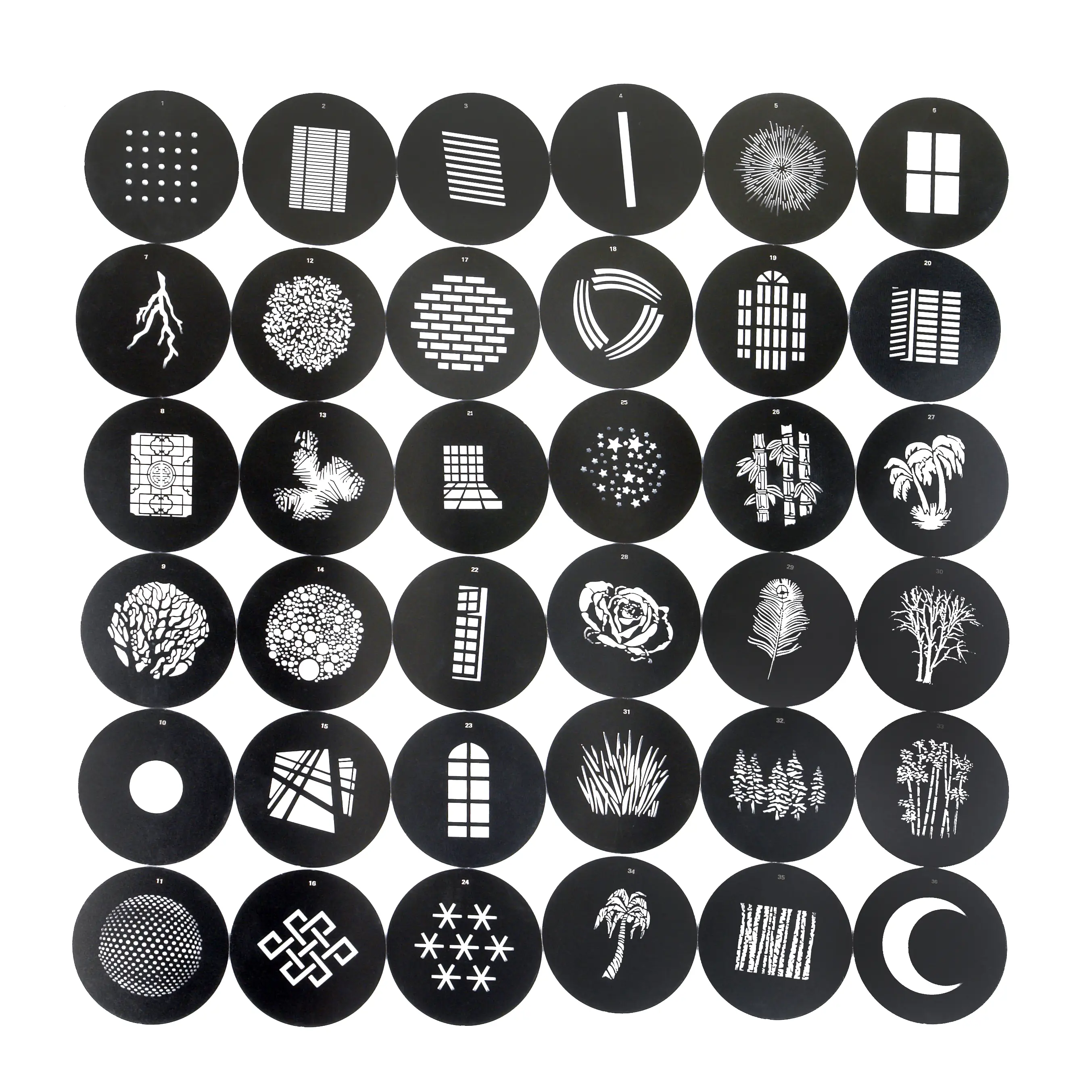 Маски ГОБО – модификаторы света, выполненные в виде пластины-трафарета ?58 мм с перфорацией в виде различных рисунков: полос, точек, листьев, веток и др. Частично ограничивая световой поток от студийной вспышки или осветителя, маски формируют световой рисунок для создания творческих эффектов в фотографии или видеосъемке.
