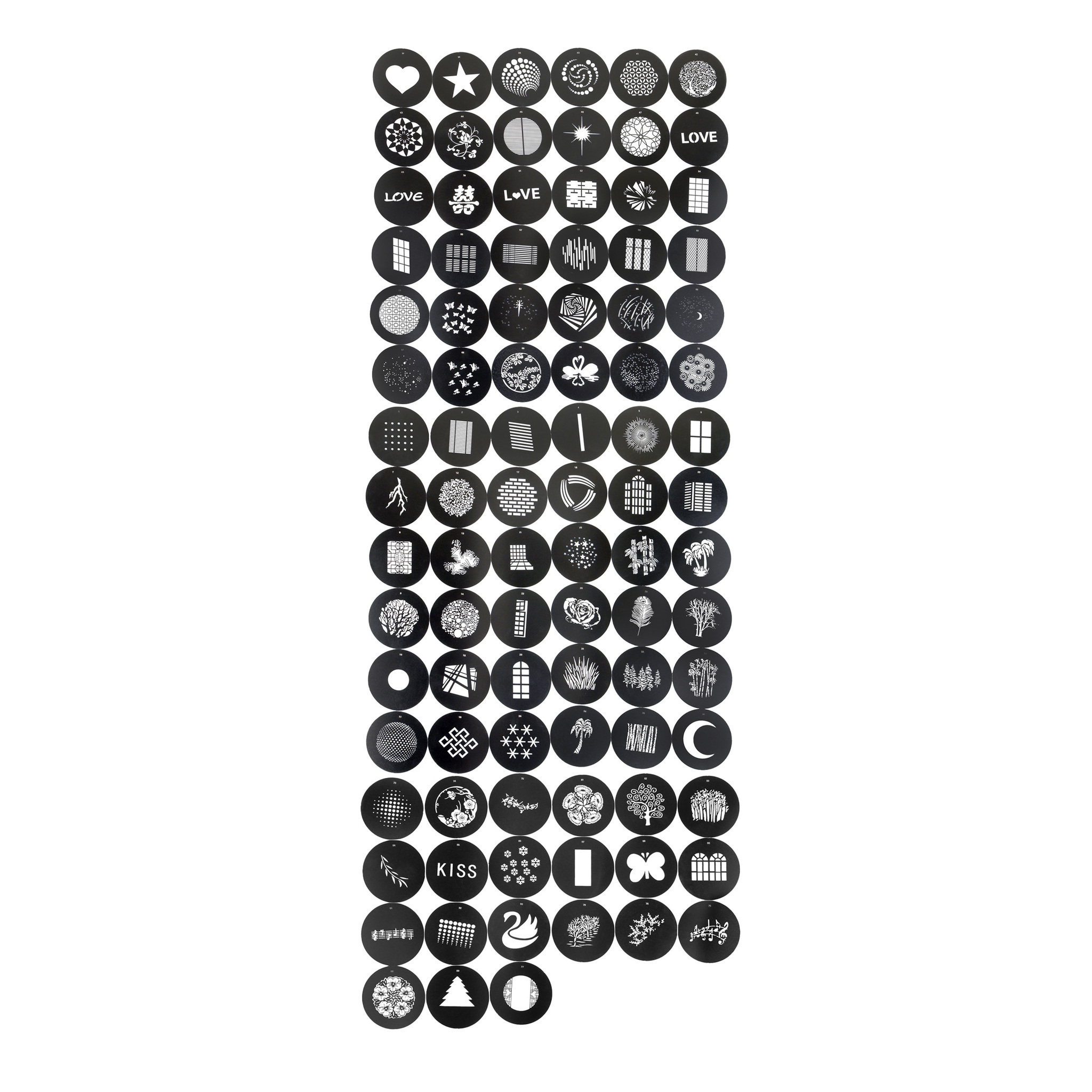 Набор предназначается для расширения комплекта масок ГОБО, поставляющихся с оптическими насадками Falcon Eyes FEA-OST2 BW, Falcon Eyes FEA-OST4 BW и Falcon Eyes FEA-OST5 BW. Маски также подходят для работы с другими оптическими насадками, имеющими держатель масок с подходящим посадочным диаметром.