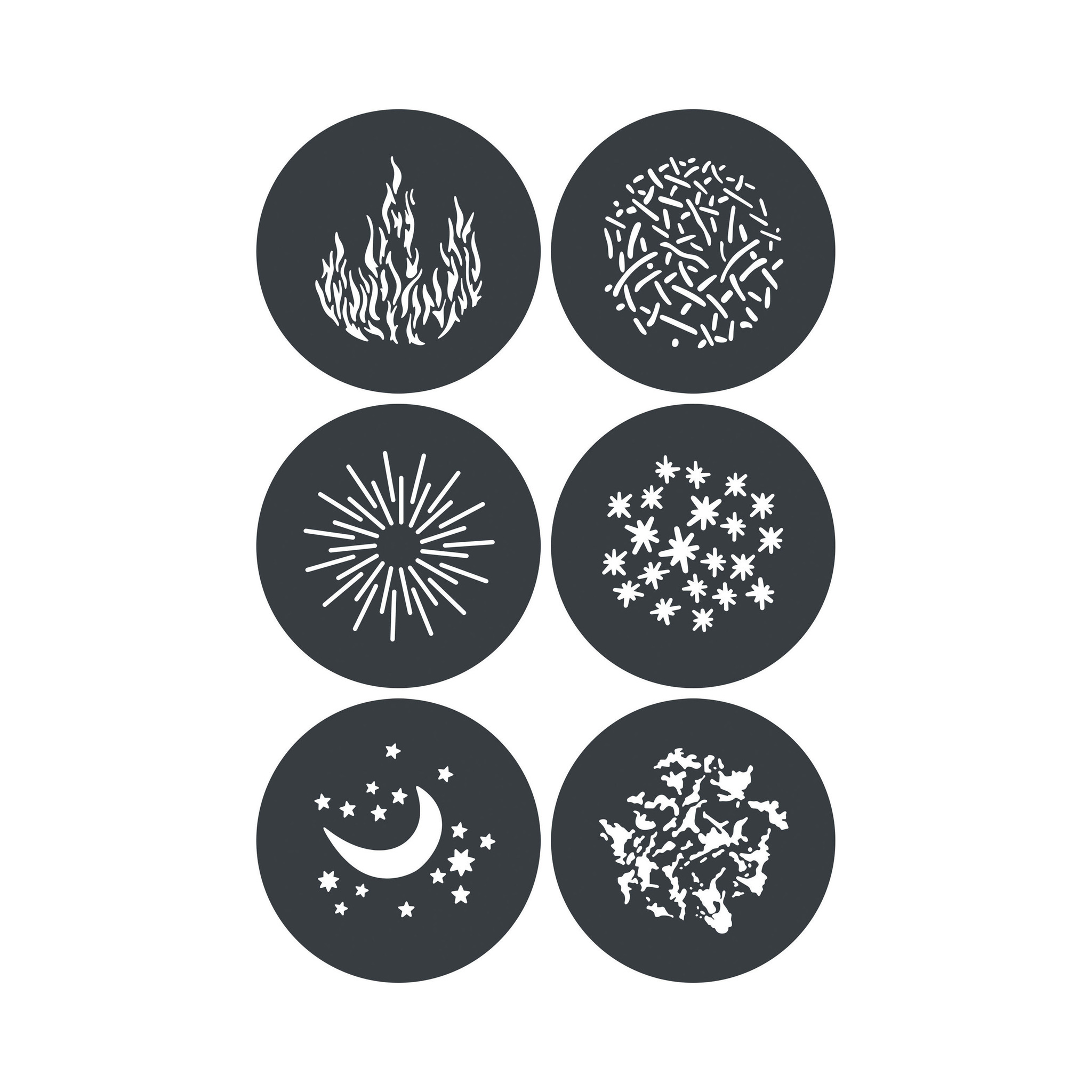 Godox Knowled GP-GS1 – набор из 6 износостойких металлических масок GOBO диаметром 148 мм для формирования светотеневого рисунка на фоне или объекте съемки.