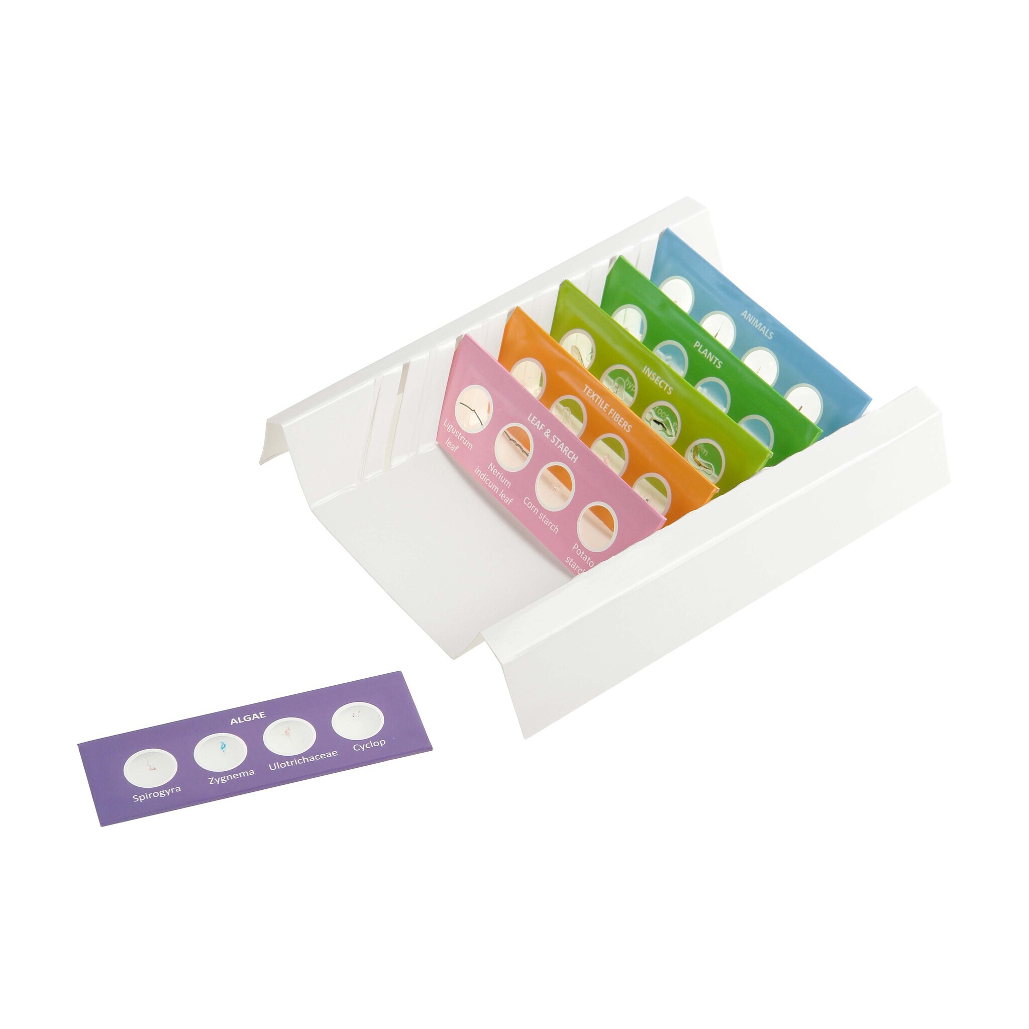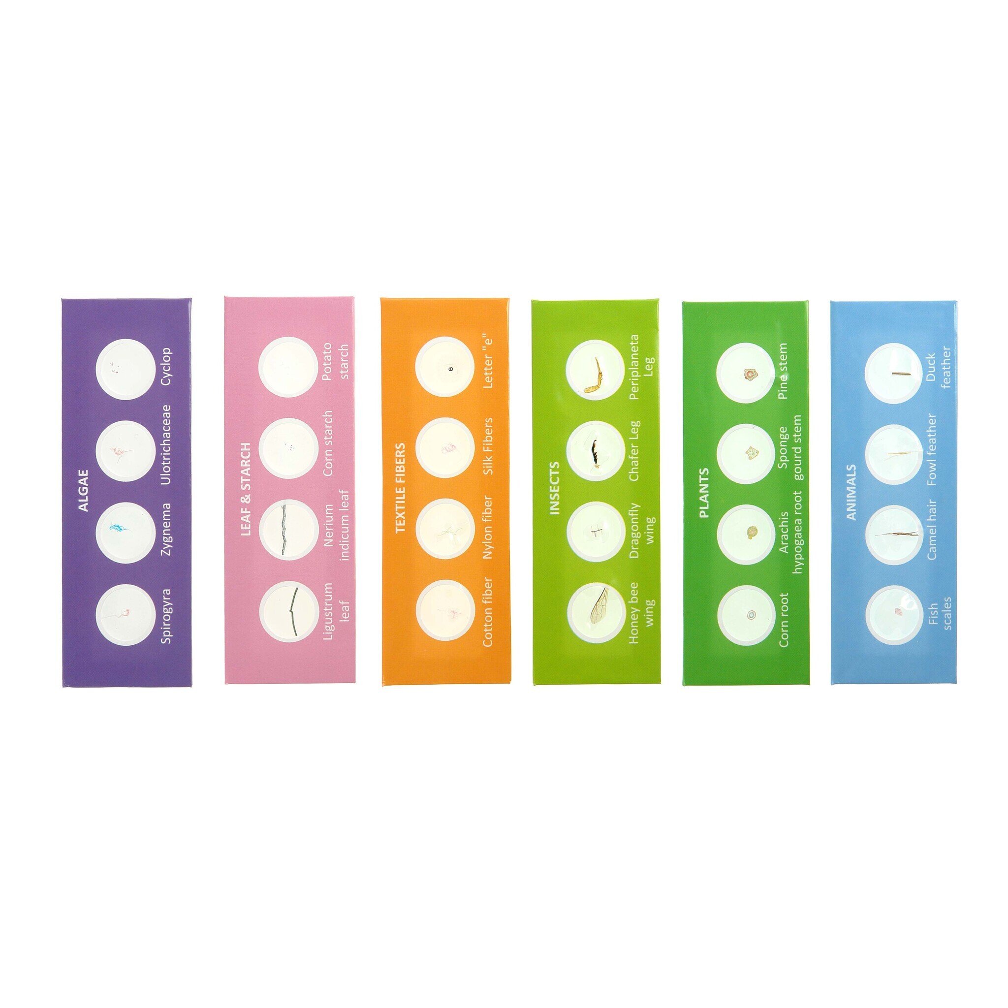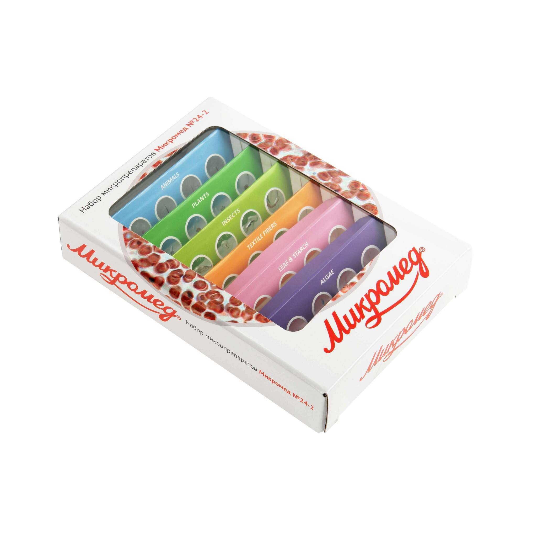 Набор микропрепаратов Микромед №24-2 состоит из 6 стёкол по четыре препарата на стекло. Микропрепараты безопасны для ребенка - стёкла оклеены цветной плёнкой.