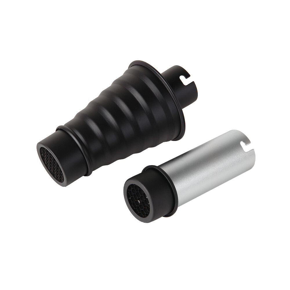 Комплект состоит из двух насадок: конической и цилиндрической. В комплект входят две съемные сотовые насадки – для создания более «жесткого» света.