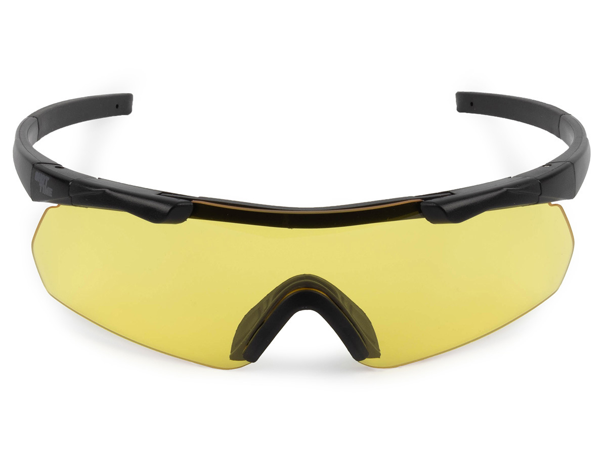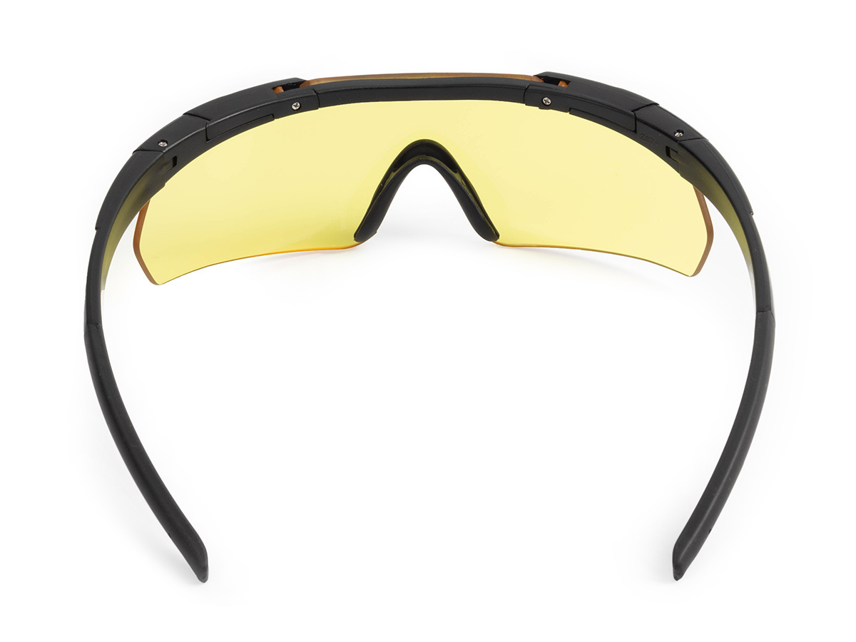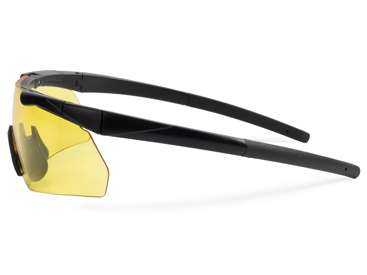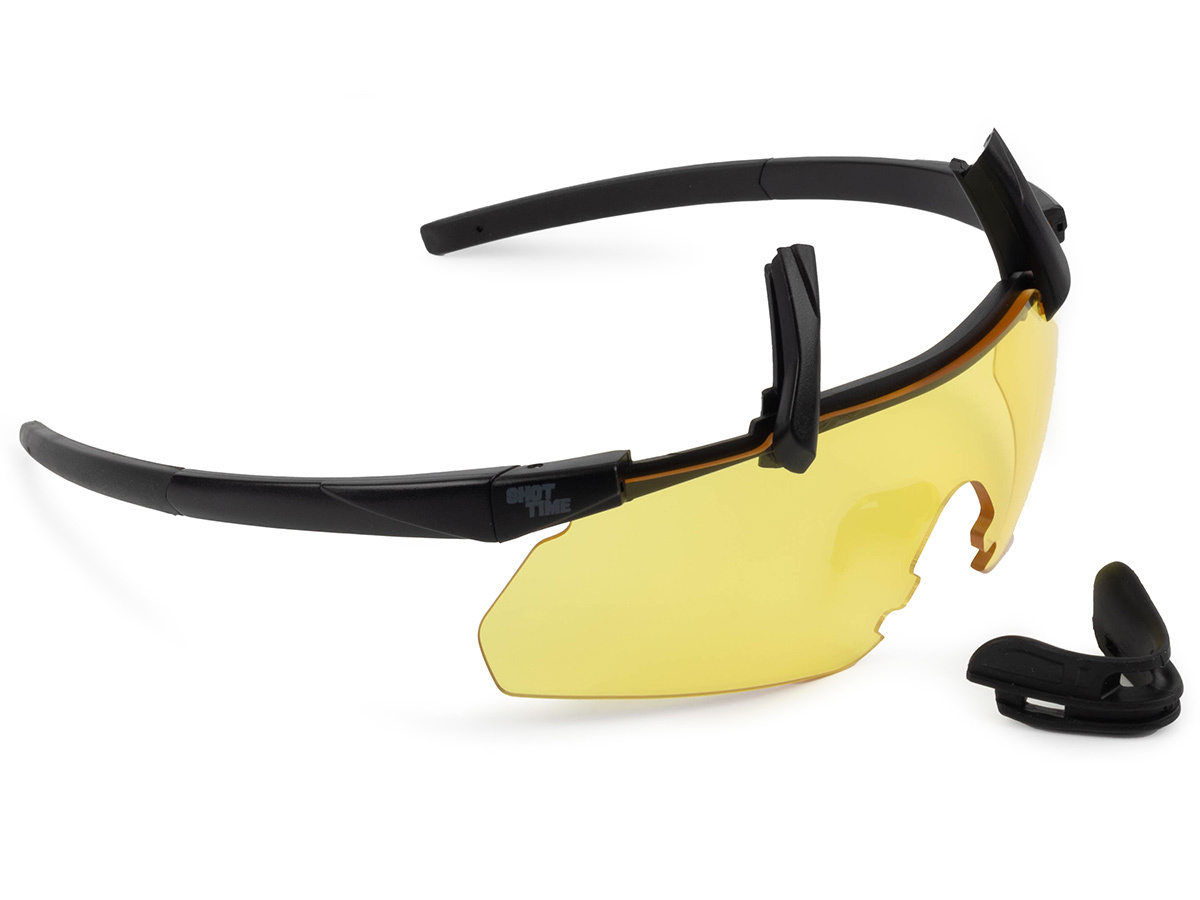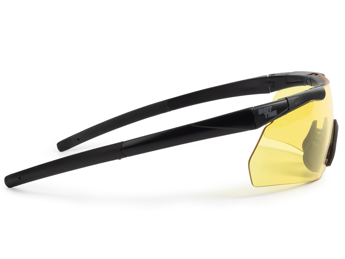 Защитные стрелковые очки ShotTime Caracal с чёрной оправой и жёлтыми линзами. Жёлтые линзы улучшают контраст видимого изображения. В них яркий свет становится более тусклым, а при недостаточном освещении «картинка» становится более контрастной.