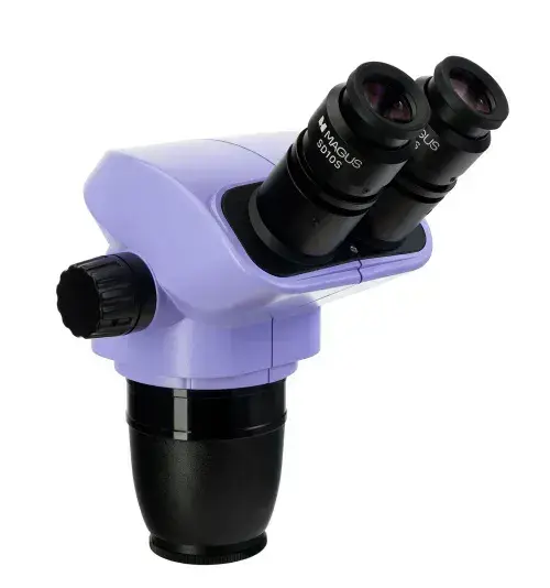 Объектив плавно изменяет увеличение в 8,4 раза без потери фокуса. Оптическая система формирует прямое (неперевернутое) объемное изображение. Дополнительные насадки на объектив изменяют диапазон увеличения, поле зрения и рабочее расстояние микроскопа.