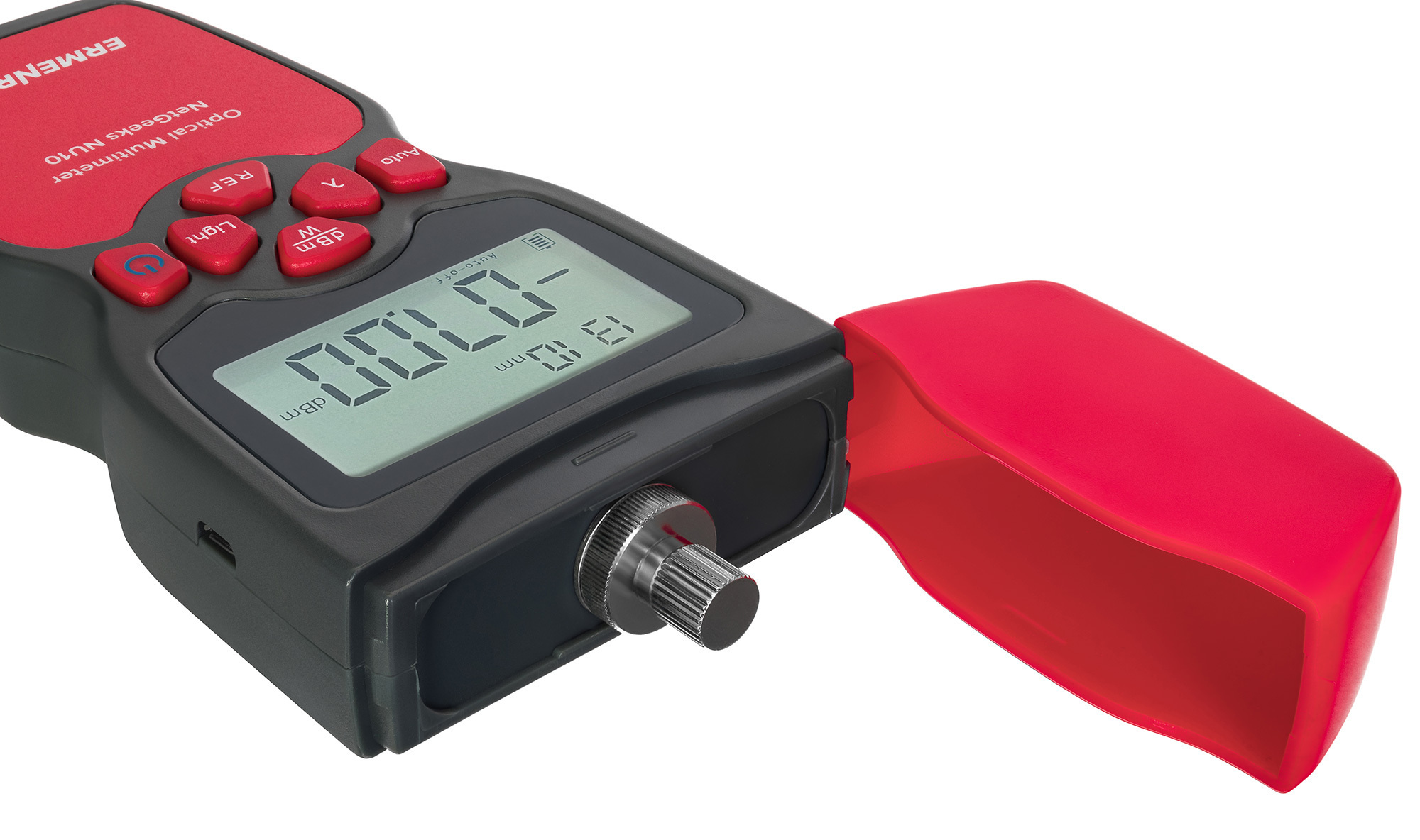 Мультиметр Ermenrich NetGeeks NU10 измеряет мощность в дБм или Вт, работает на длинах волн 850, 1300, 1310, 1490, 1550, 1625 нм. Есть возможность установить опорный уровень при определении потерь. Для подключения к линии предусмотрен встроенный интерфейс FC, а также сменные интерфейсы SC, ST. Разъем подключения закрывается противопылевой пластиковой крышкой. Результаты замеров отображаются на монохромном ЖК-дисплее с подсветкой.