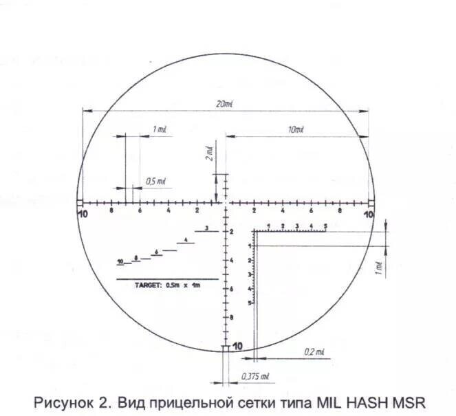 Прицел снабжен прицельной сеткой MIL HASH MSR расположенной в первой фокальной плоскости (FFP), таким образом сетка не меняет своих угловых размеров относительно цели при изменении кратности прицела. Сетка выполнена методом гравировки на стекле и может подсвечиваться красным цветом для повышения контрастности в условиях низкой освещенности. Подсветка имеет 11 уровней яркости.