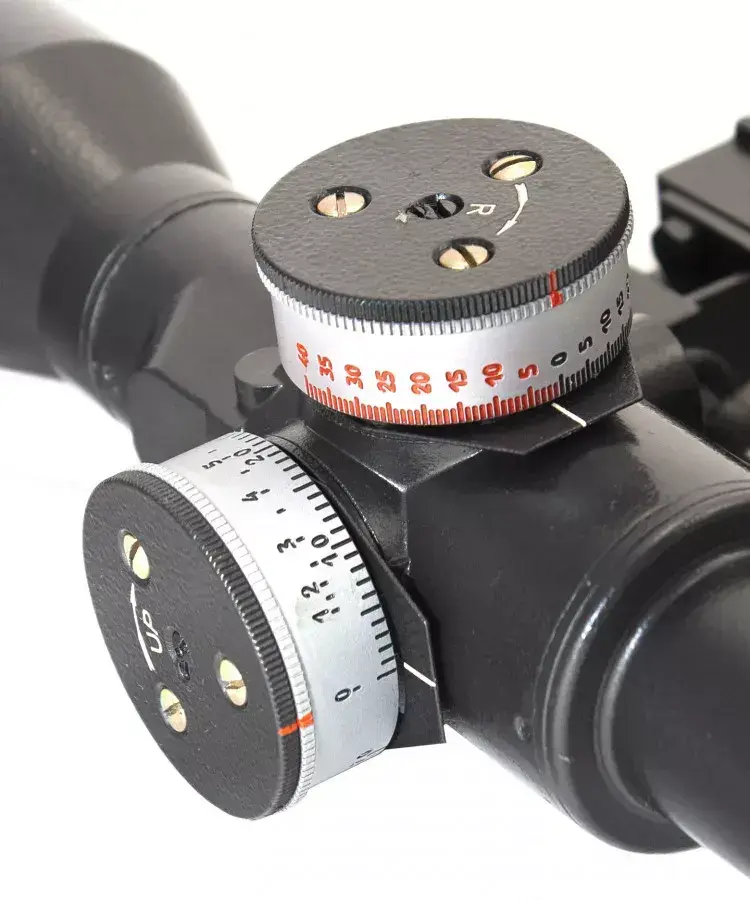 Верхний маховичок имеет две шкалы: шкала углов прицеливания и баллистическая шкала в метрах под патрон 7,62х54R.