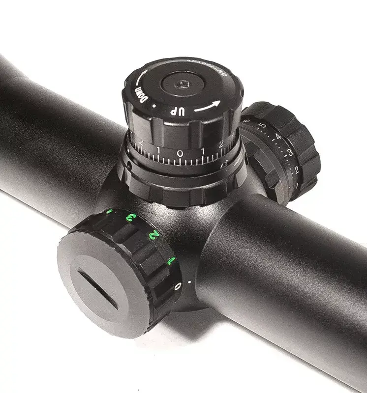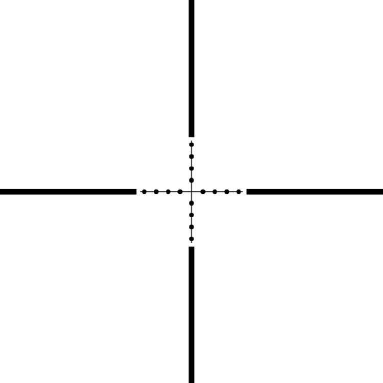 Сетка Милдот, выгравированная на линзе, будет надёжней и долговечней, чем сетка-нить. От классической Mil-Dot отличается большим масштабом и увеличенным расстоянием между мил-точками: 12,5 см на 100 м при стандарте 10 см на 100 м дистанции. При такой разметке получается, что 1 м на удалении 100 м укладывается между крайними мил-точками, а не между «жирными» штрихами, как у обычной сетки. Центральная тонкая часть (крест с точками) имеет двойную подсветку — красным и зелёным, с 5 уровнями яркости для каждого цвета. Маркировка барабанчика подсветки выполнена в цвете, чтобы проще было ориентироваться при настройке яркости.