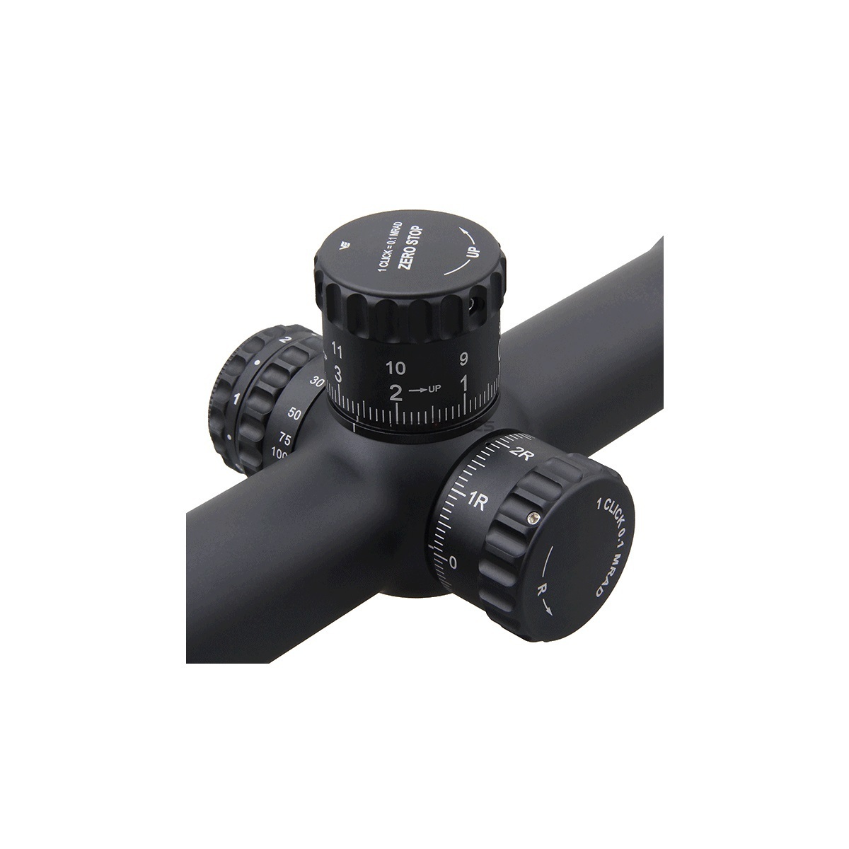 Боковая отстройка от параллакса от 18,3 м. Тактические барабаны. Вся механика рассчитана на манипуляции в перчатках. Барабаны выверки высокие, открытые, с разметкой в милах (как и у сетки) и очень точными, чёткими кликами, которые хорошо воспринимаются и тактильно, и на слух. Боковой барабан оснащён подпружиненной системой блокировки настроек и вращается только, если оттянуть его до упора вбок. Верхний барабан снабжён системой блокировки «нуля» или Zero Stop. После блокировки поправки на дальность вносятся только выше «0», без ухода в минус (используется только 1/2 полного диапазона выверки), что существенно упрощает возврат к нулевой дистанции пристрелки. В комплекте есть запасной неоцифрованный колпачок для вертикальной выверки (тоже с Зеро Стоп), который можно разметить под свой боезапас.