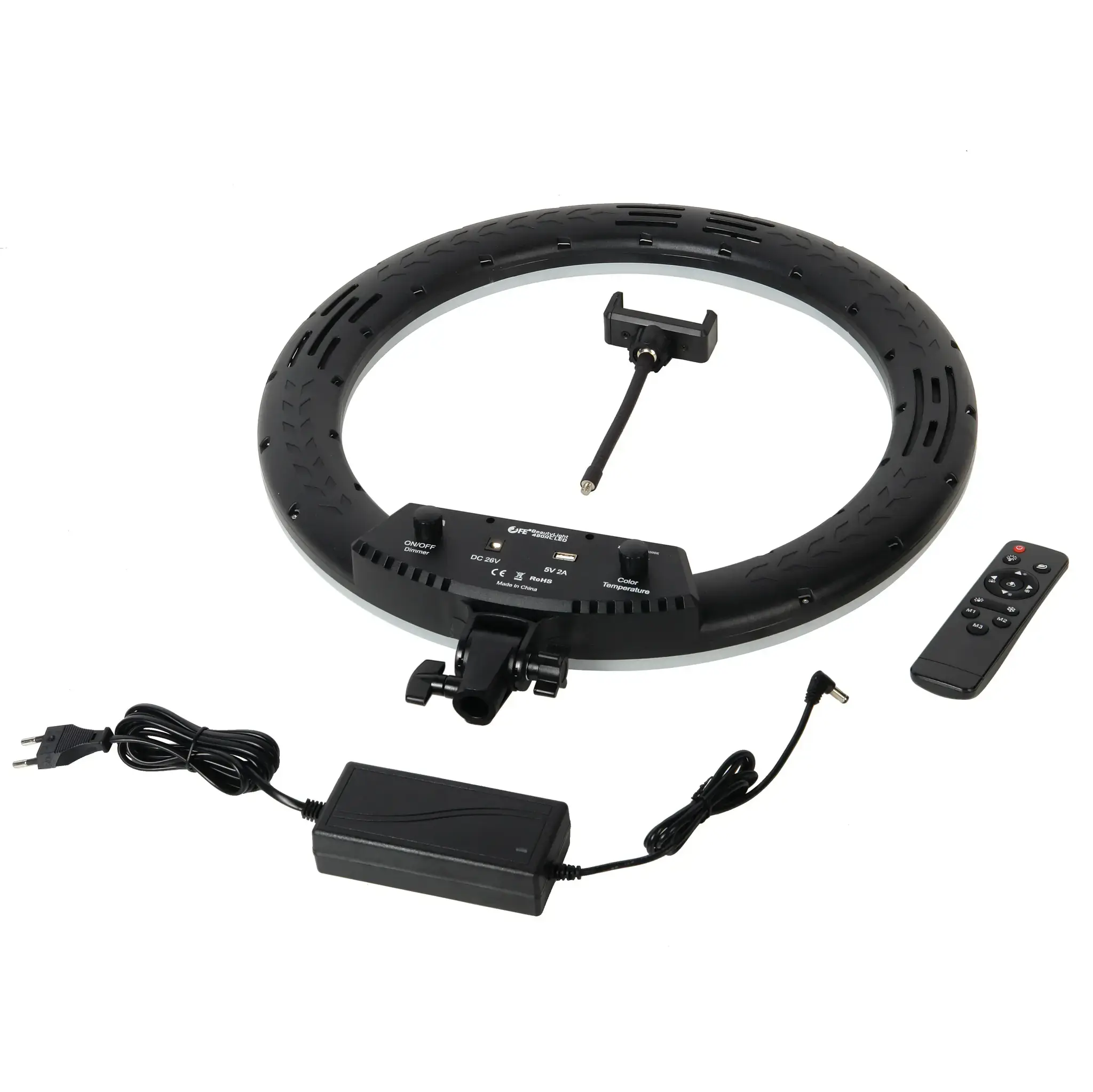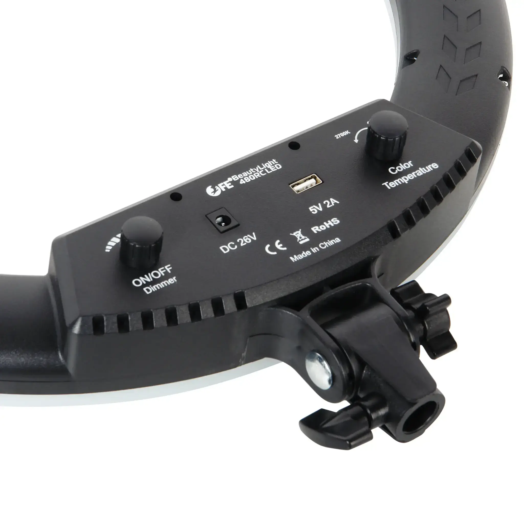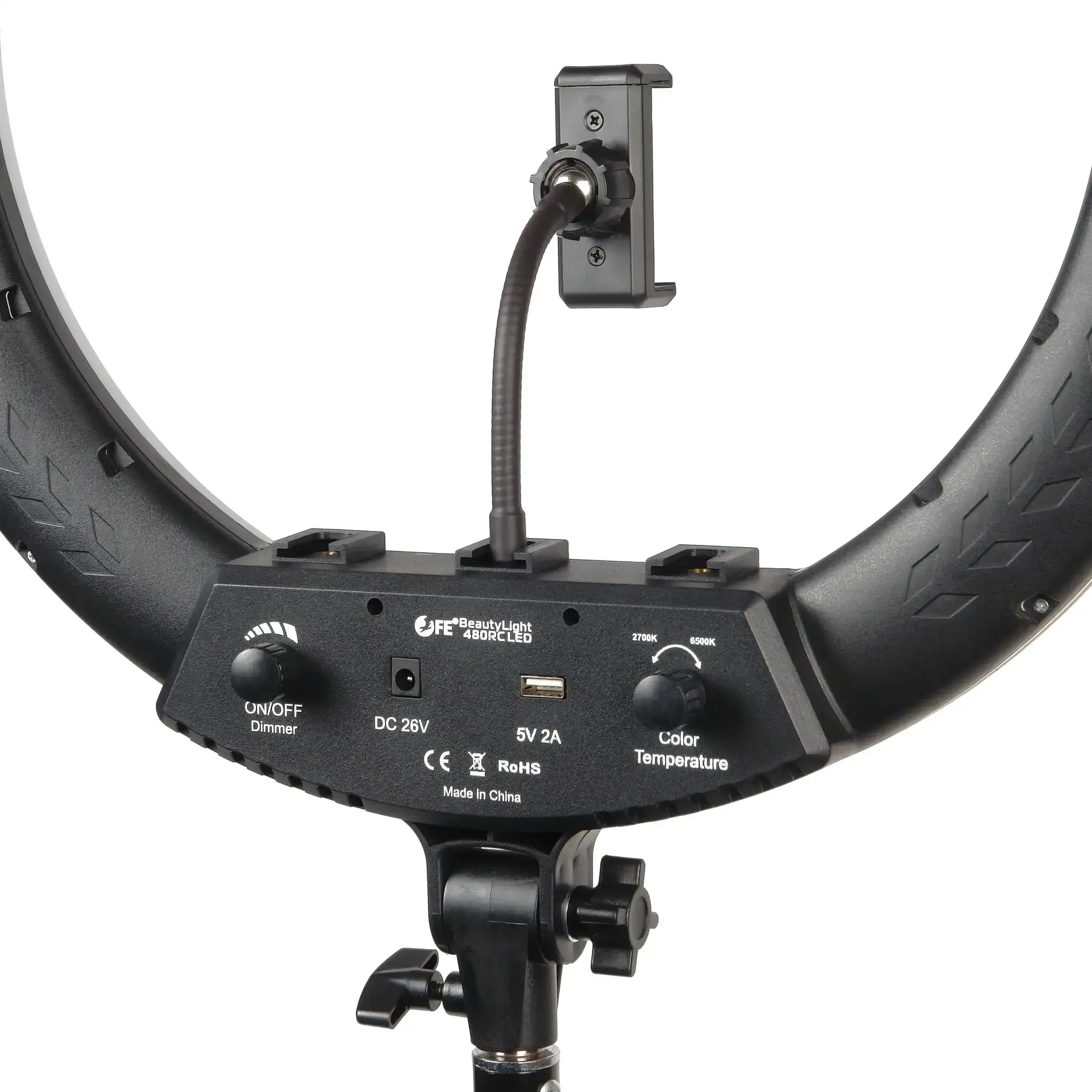 Falcon Eyes BeautyLight 480RC LED – компактный кольцевой осветитель со световой панелью внешним диаметром 46 см, на которой расположено 240 светодиодов теплого и холодного света, с плавно регулируемой мощностью светового потока от 10 до 100% (50 Вт). Пользователь может одним диммером выставить нужную цветовую температуру, а другим уже регулировать мощность светового потока. Держатель для смартфона и пульт дистанционного управления входят в комплект.