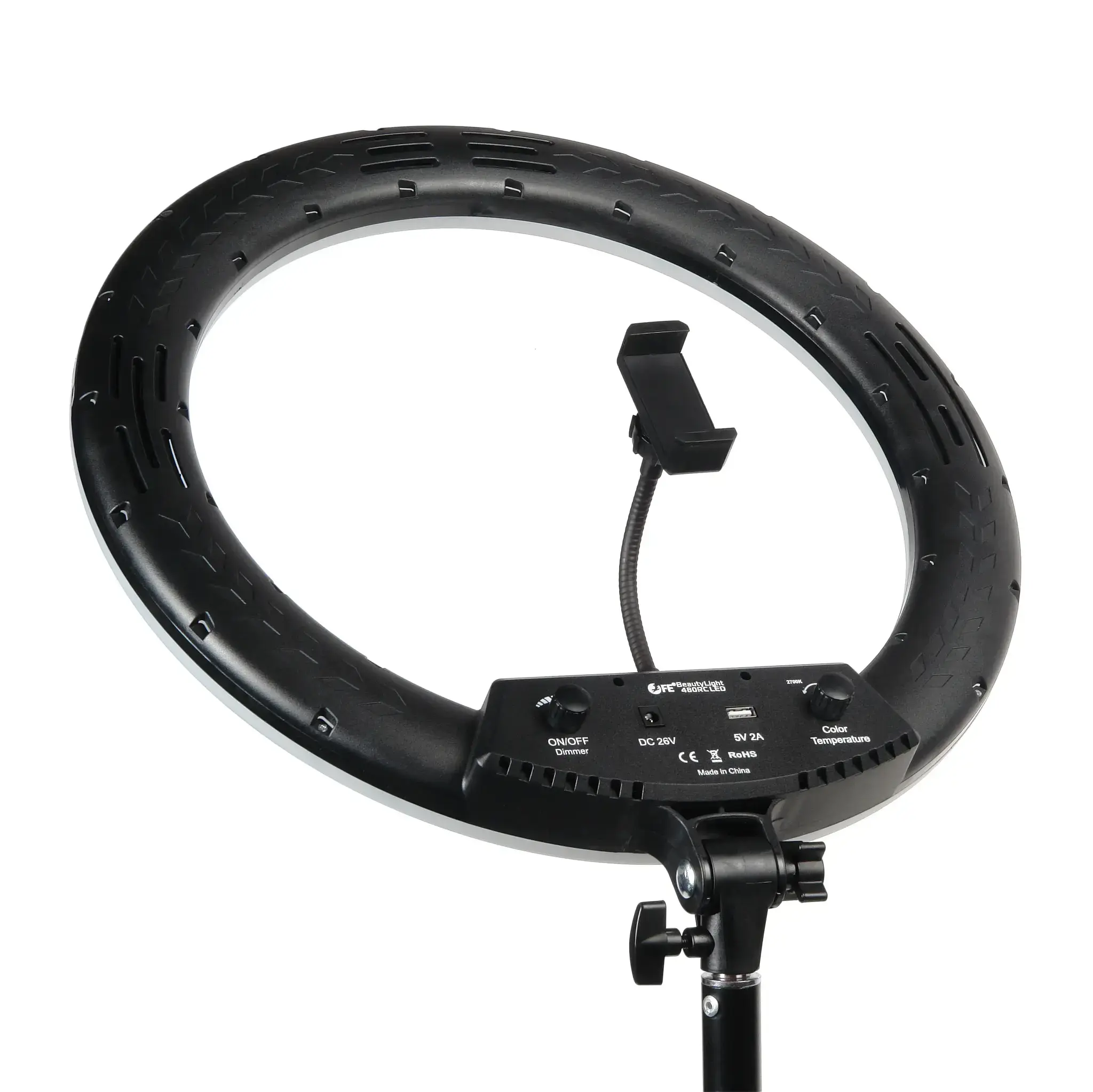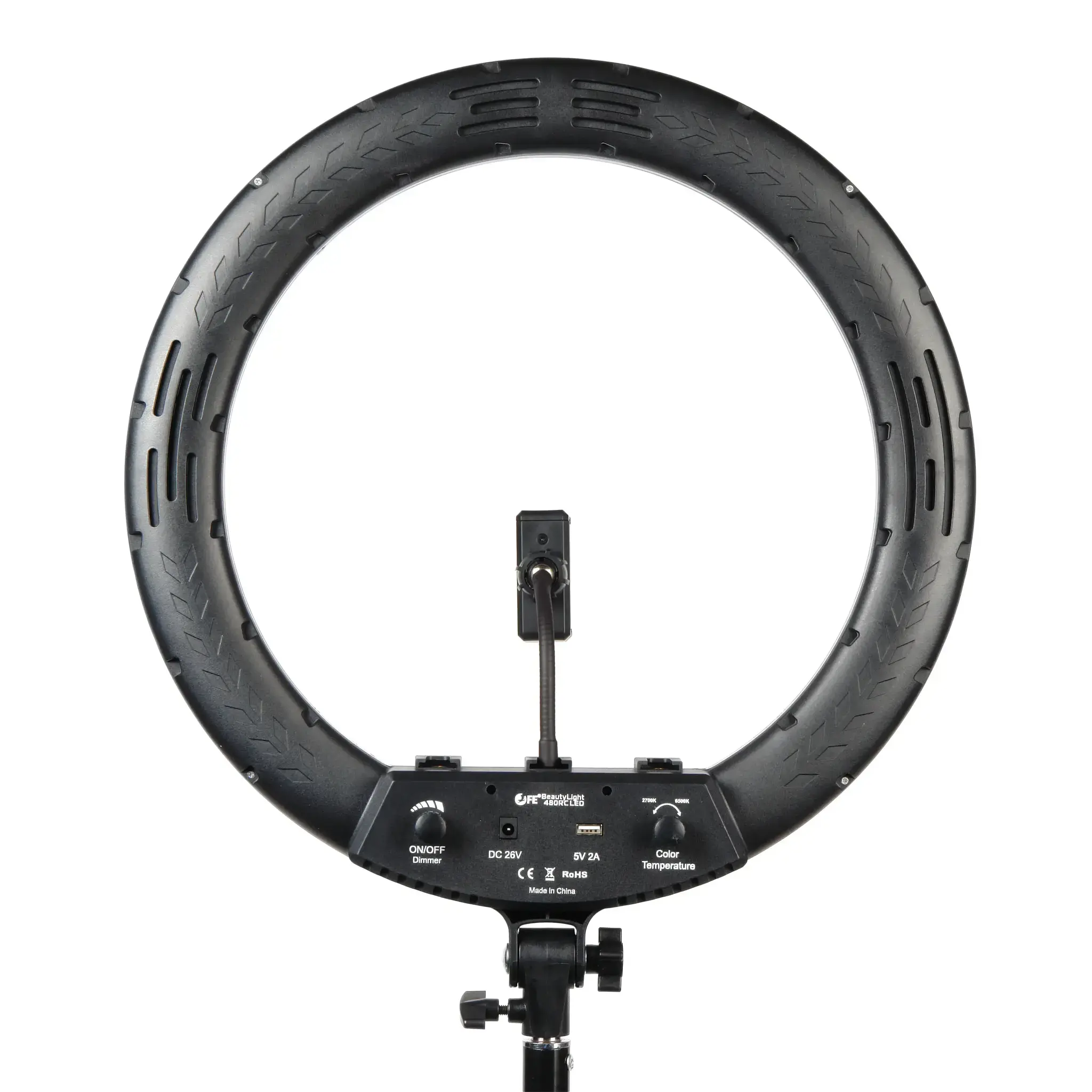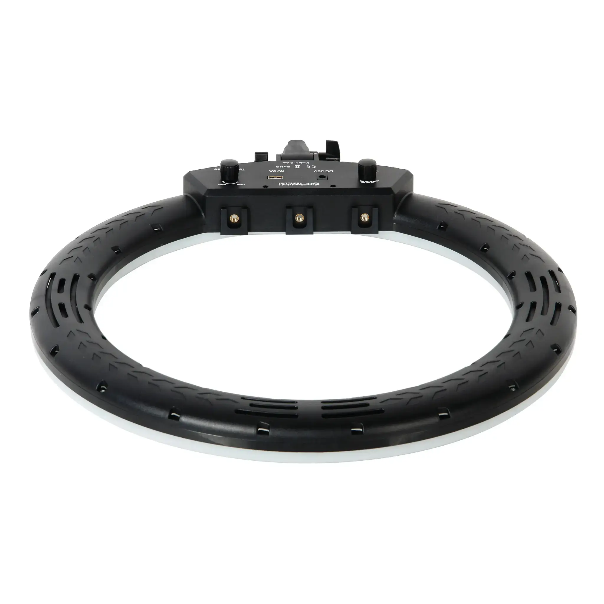 Falcon Eyes BeautyLight 480RC LED – компактный кольцевой осветитель со световой панелью внешним диаметром 46 см, на которой расположено 240 светодиодов теплого и холодного света, с плавно регулируемой мощностью светового потока от 10 до 100% (50 Вт). Пользователь может одним диммером выставить нужную цветовую температуру, а другим уже регулировать мощность светового потока. Держатель для смартфона и пульт дистанционного управления входят в комплект.