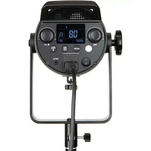 С тыльной стороны осветителя расположена панель управления с цифровым ЖК-дисплеем. На панели находятся два регулятора, использующиеся также как кнопки, 4 кнопки переключения режимов, тумблер питания и синхроразъем. Там же на панели расположен сетевой разъем для крепления кабеля питания с длиной шнура 5 м. На контрастном черно-белом (белые символы на черном фоне) ЖК-дисплее размером 50х35 мм отображаются выбранные режимы и установленные значения.