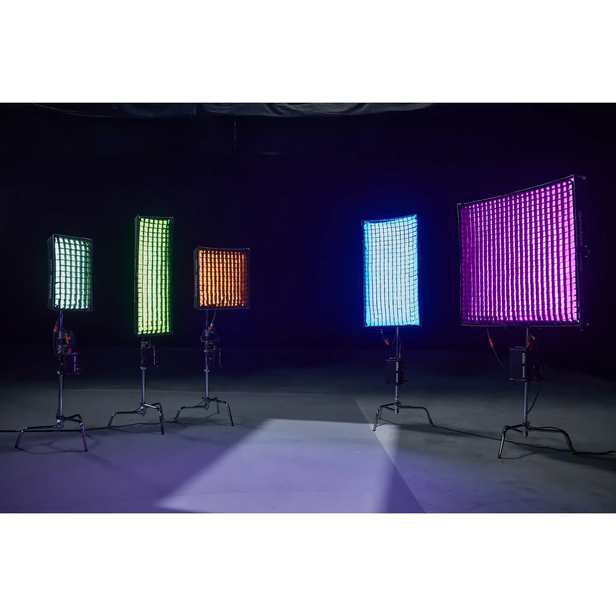 Осветитель представляет собой тонкую гибкую панель размером 60х120 см, которая крепится на металлический X-кронштейн или натягивается с помощью люверсов и липучек, благодаря чему осветитель можно размещать в ограниченном пространстве, на углах, выступах и иных неровных поверхностях.