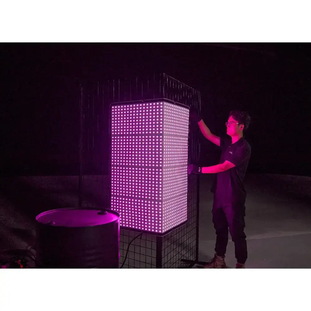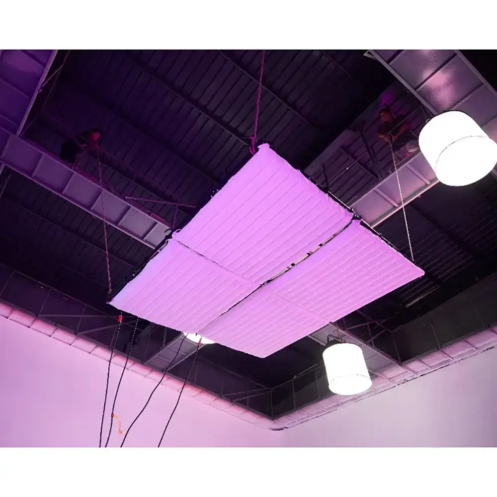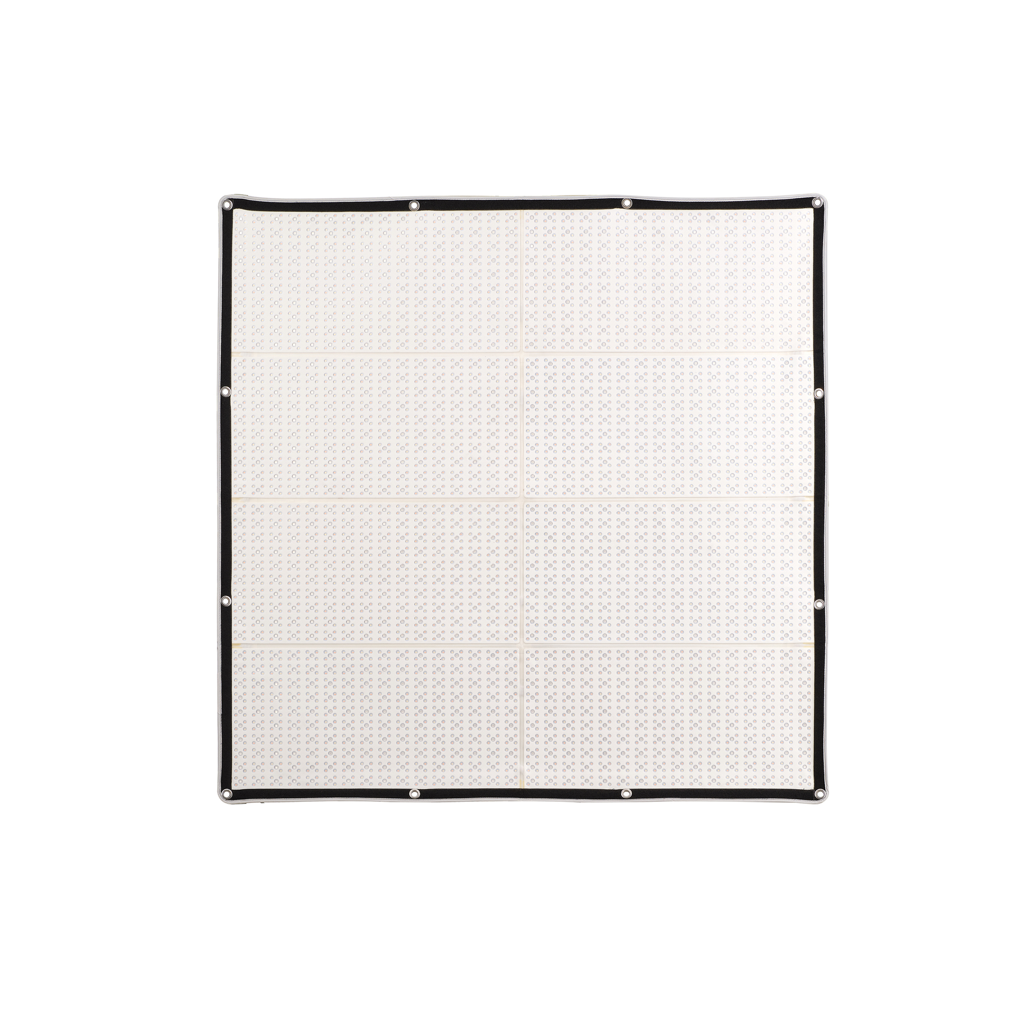 Осветитель представляет собой ультратонкую гибкую панель размером 120х120 см, которая крепится на металлическую раму или натягивается с помощью люверсов и липучек, благодаря чему осветитель можно размещать в ограниченном пространстве, на углах, выступах и иных неровных поверхностях.