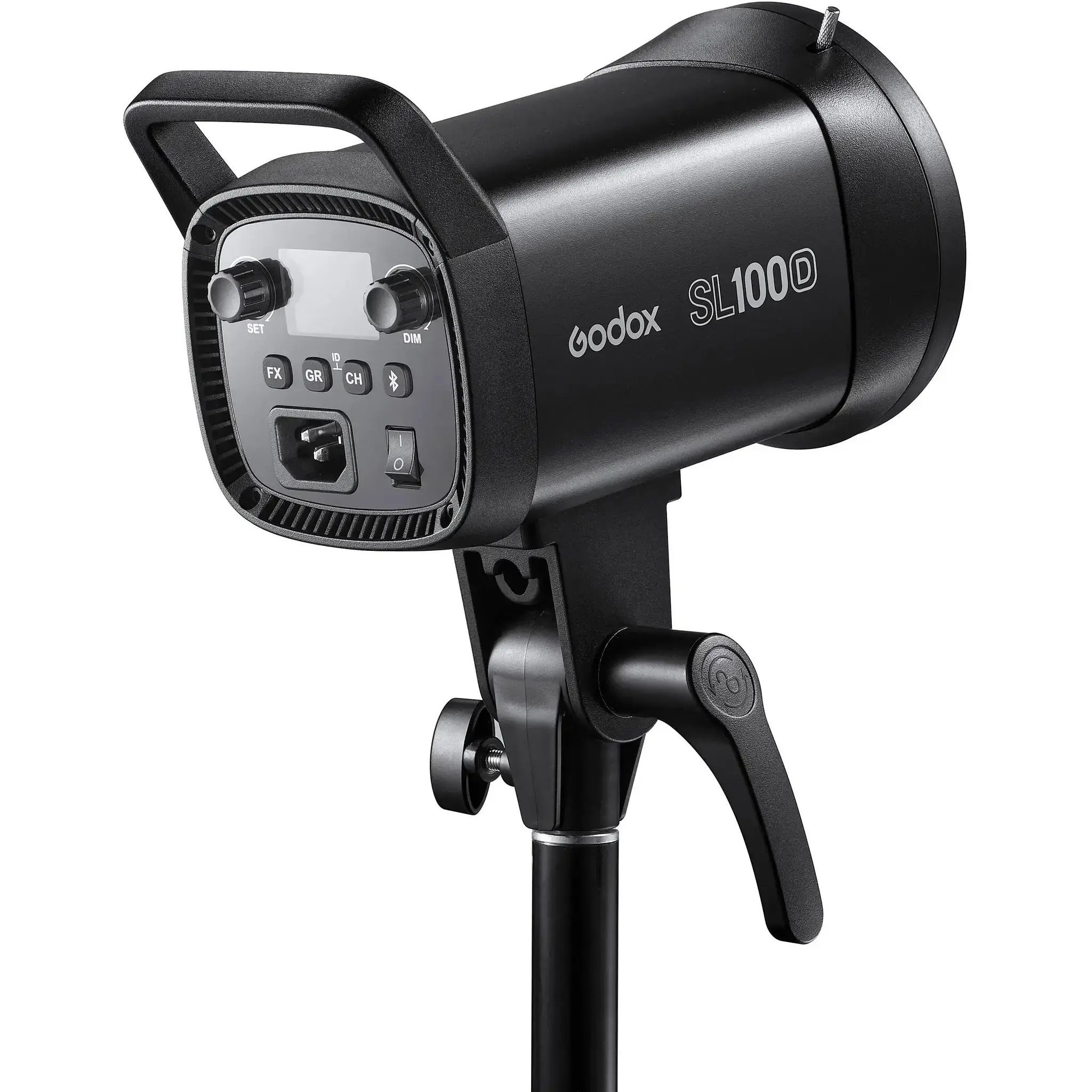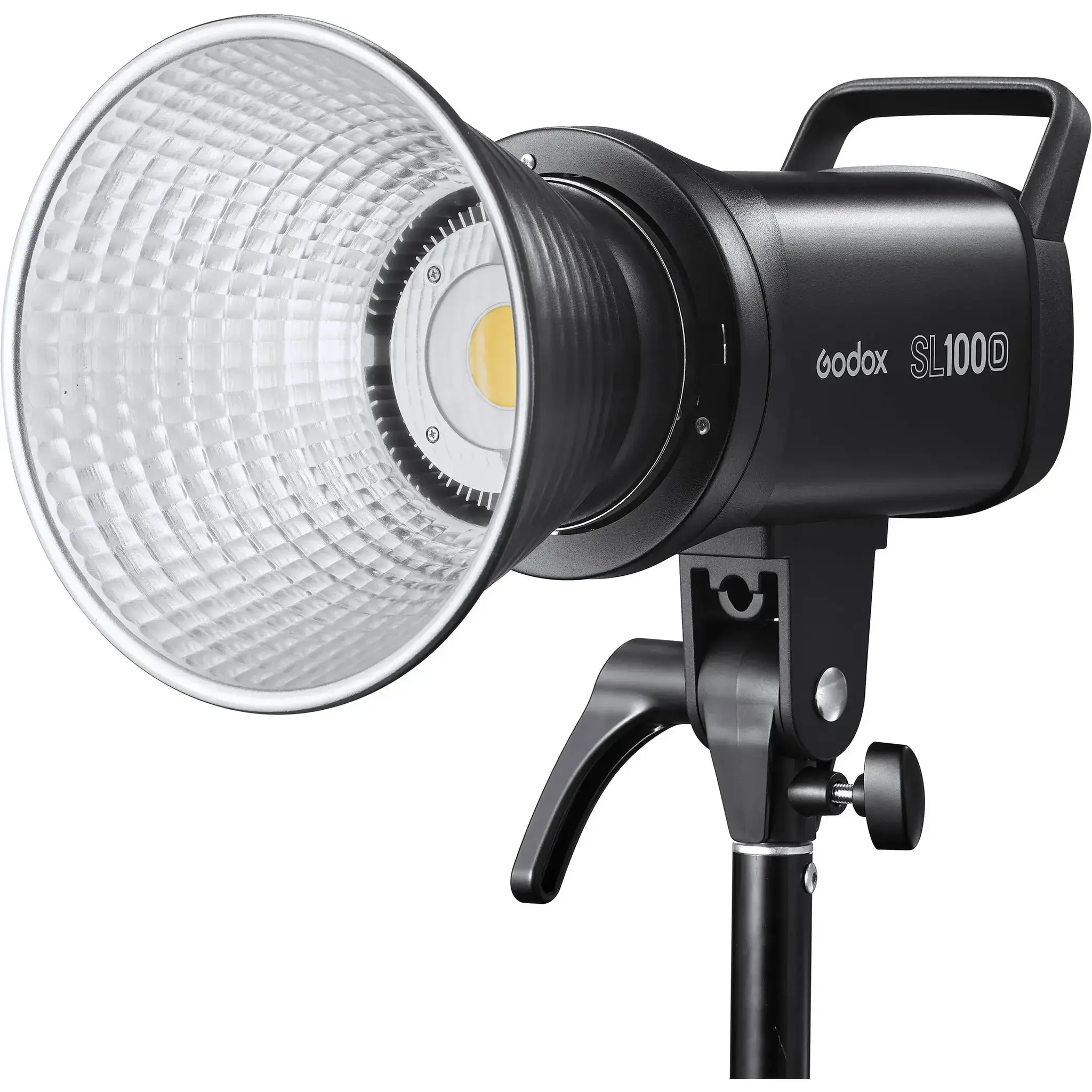 Godox SL100D – бюджетный, компактный и очень мощный светодиодный осветитель, выдающий световой поток с постоянной цветовой температурой 5600 К (сбалансированной по дневному свету) и регулируемой яркостью от 0 до 100%. Максимальная освещенность на расстоянии 1 метра со стандартным «зеркальным» рефлектором (входящим в комплект) составляет 32100 лк.