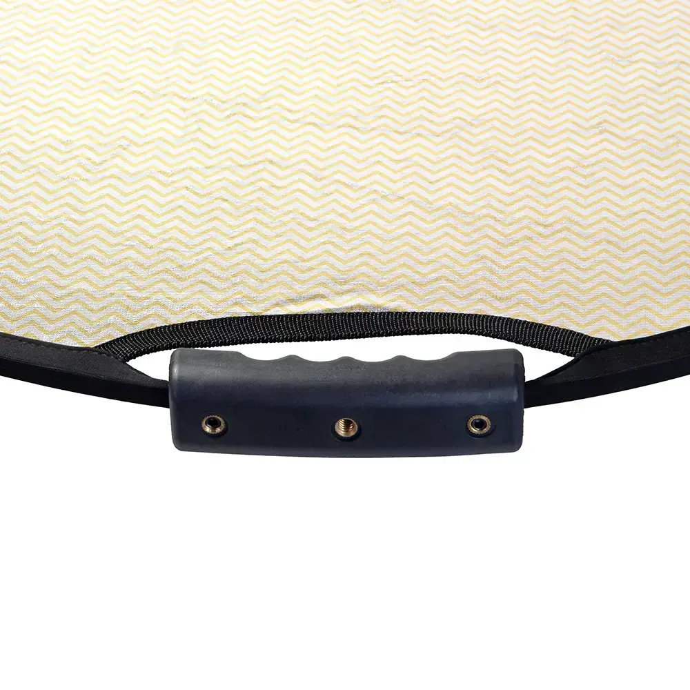 Стальной упругий каркас прошит по периметру капроновым карманом, диаметр отражателя в сложенном виде – 20 см. Две рукоятки, закрепленные на каркасе, оборудованы отверстиями с резьбой 1/4", что позволяет закрепить отражатель на штативах, стойках или любых других опорах, без использования специального держателя.