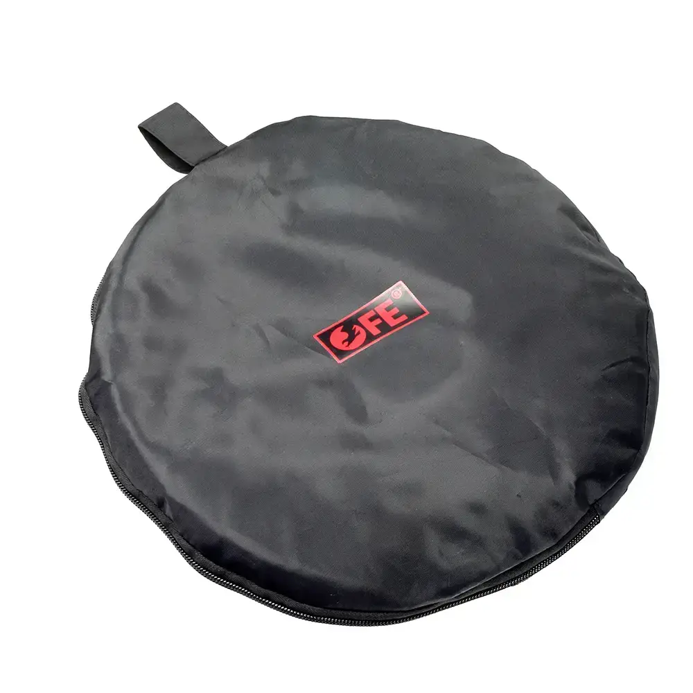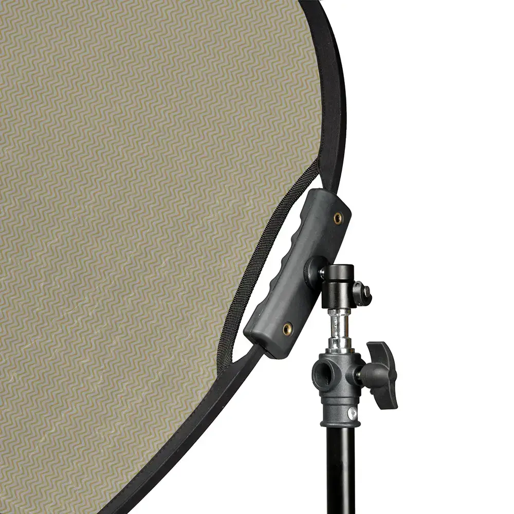 Стальной упругий каркас прошит по периметру капроновым карманом, диаметр отражателя в сложенном виде – 40 см. Две рукоятки, закрепленные на каркасе, оборудованы отверстиями с резьбой 1/4", что позволяет закрепить отражатель на штативах, стойках или любых других опорах, без использования специального держателя.