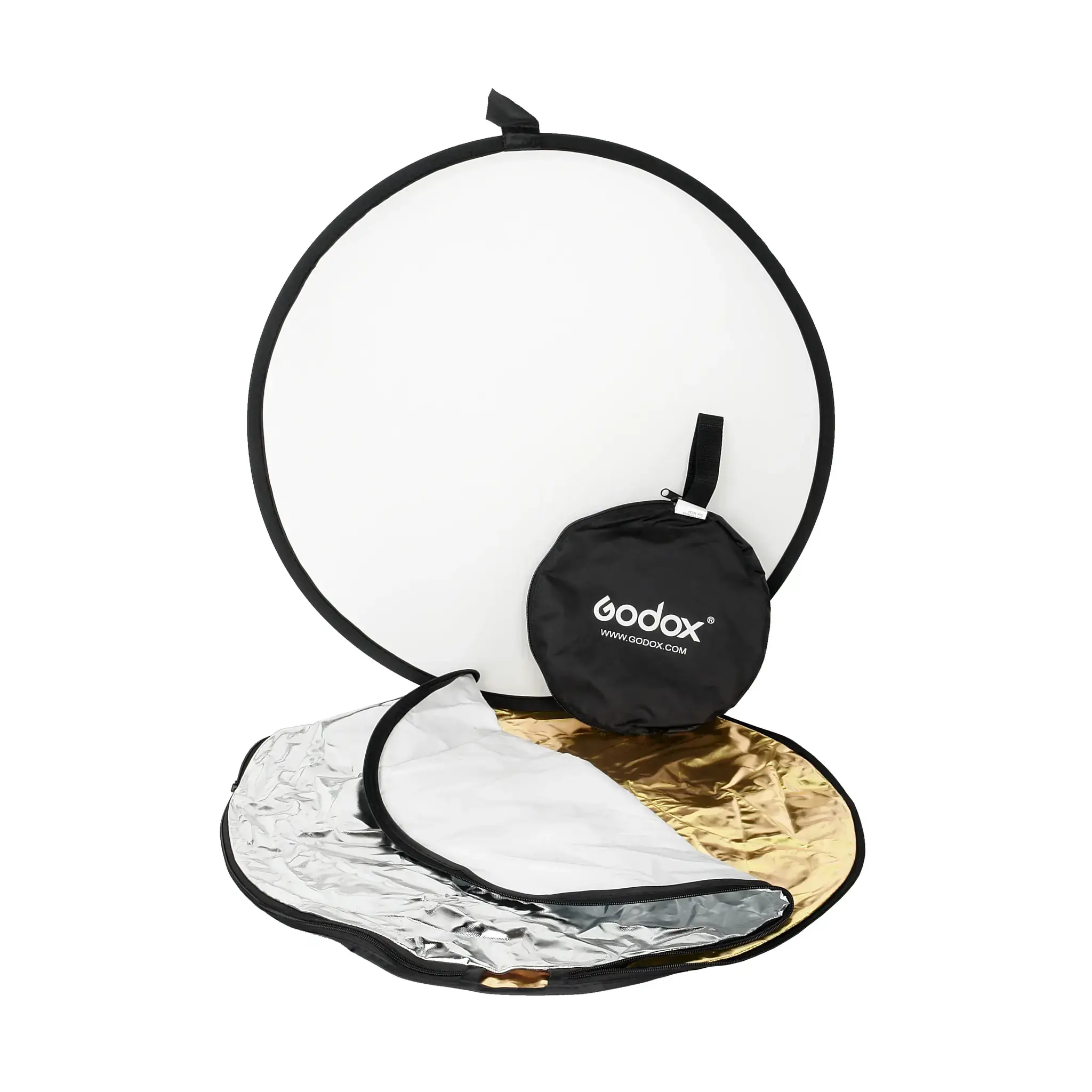 Конструкция отражателя Godox RFT-05 из пружинного стального обруча с натянутой на него полупрозрачной рассеивающей тканью и двух чехлов на молнии со светоформирующими поверхностями. Отражатели легки и удобны в сборке, устойчивы к износу. Рабочий диаметр 60 см.