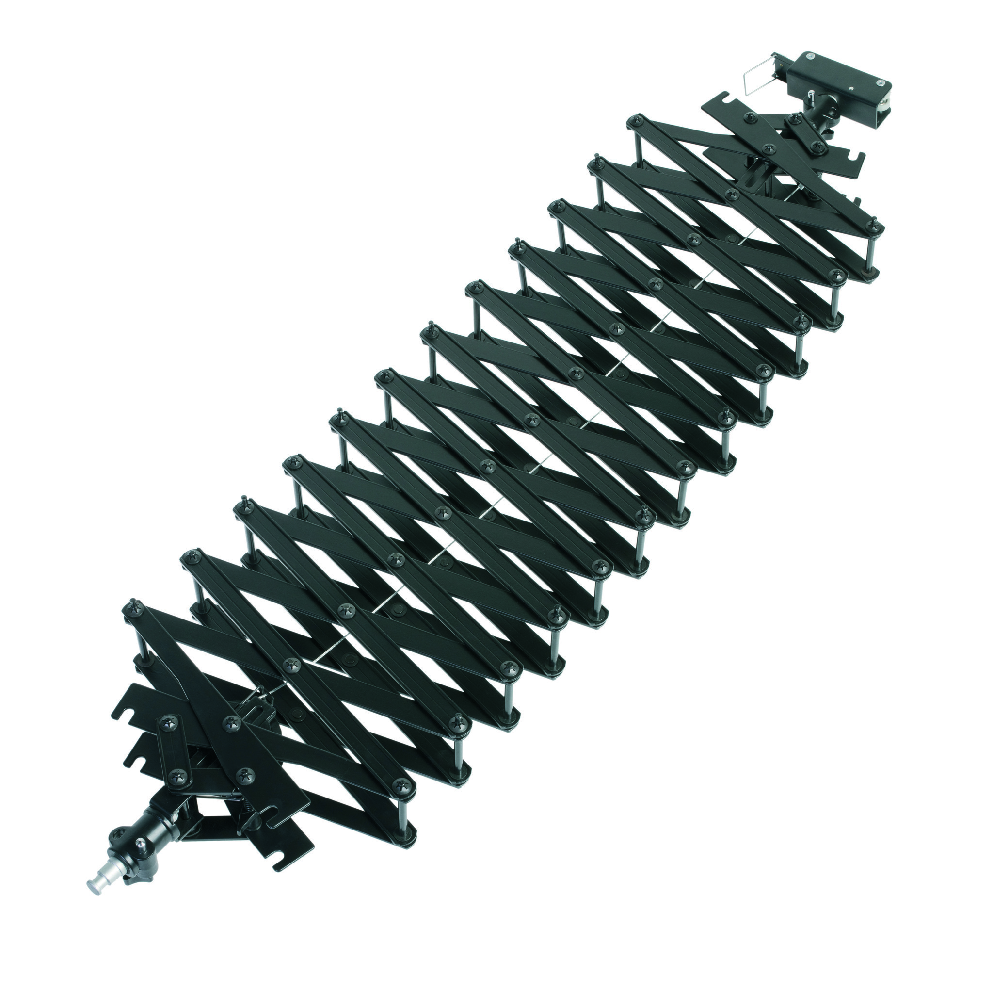 Максимальная длина пантографа 3.3 м, минимальная длина 55 см, он способен размещать оборудование весом от 1 до 15 кг. Регулируемый амортизатор позволяет сделать перемещение установленного оборудования плавным и безопасным вне зависимости от веса. Регулировка жесткости амортизатора осуществляется комплектным ключом. Если нагрузка на пантограф большая, то жесткость амортизатора увеличивают, а если нет — уменьшают. Под действием амортизатора, высота установки осветителя легко меняется, а оборудование не пострадает от случайного удара.