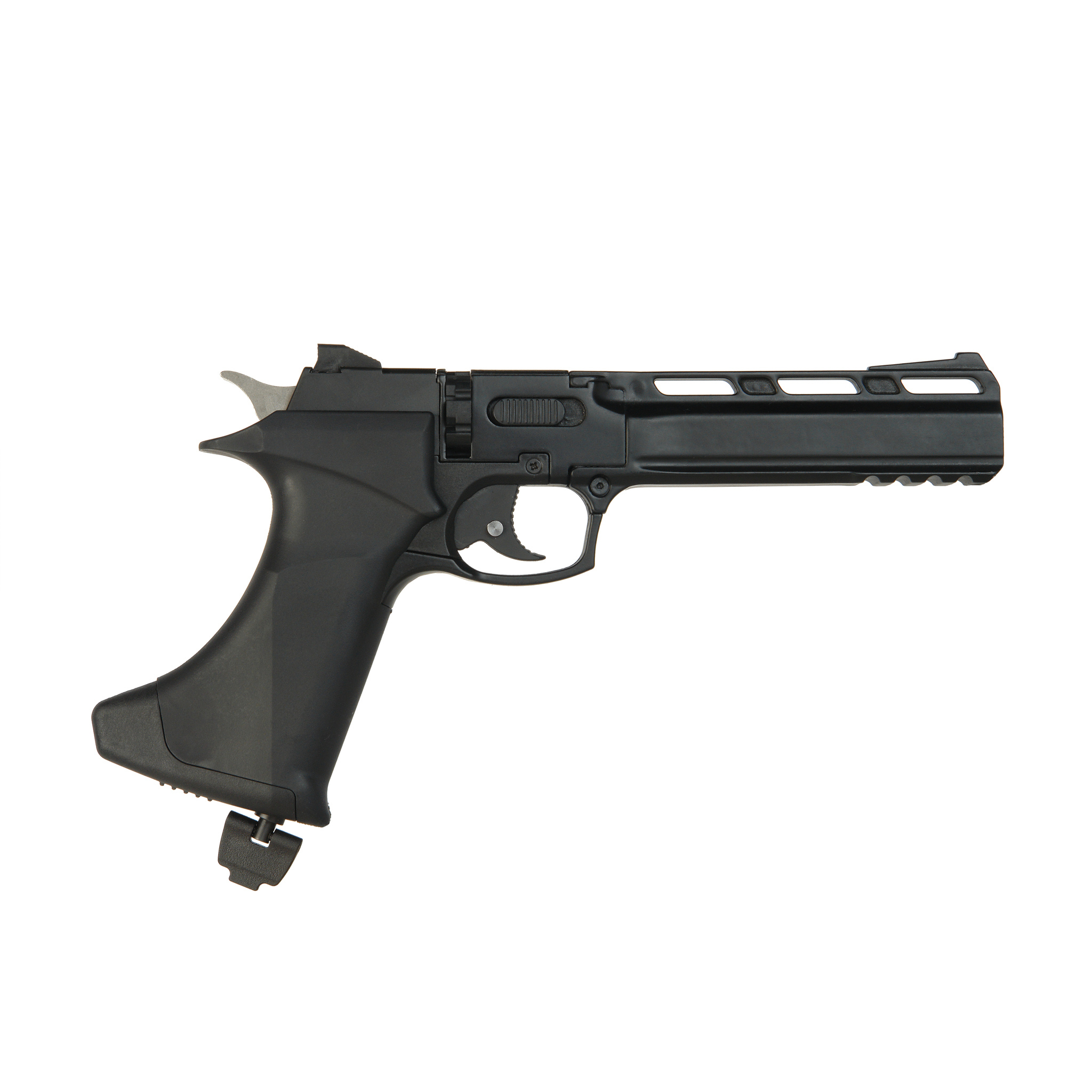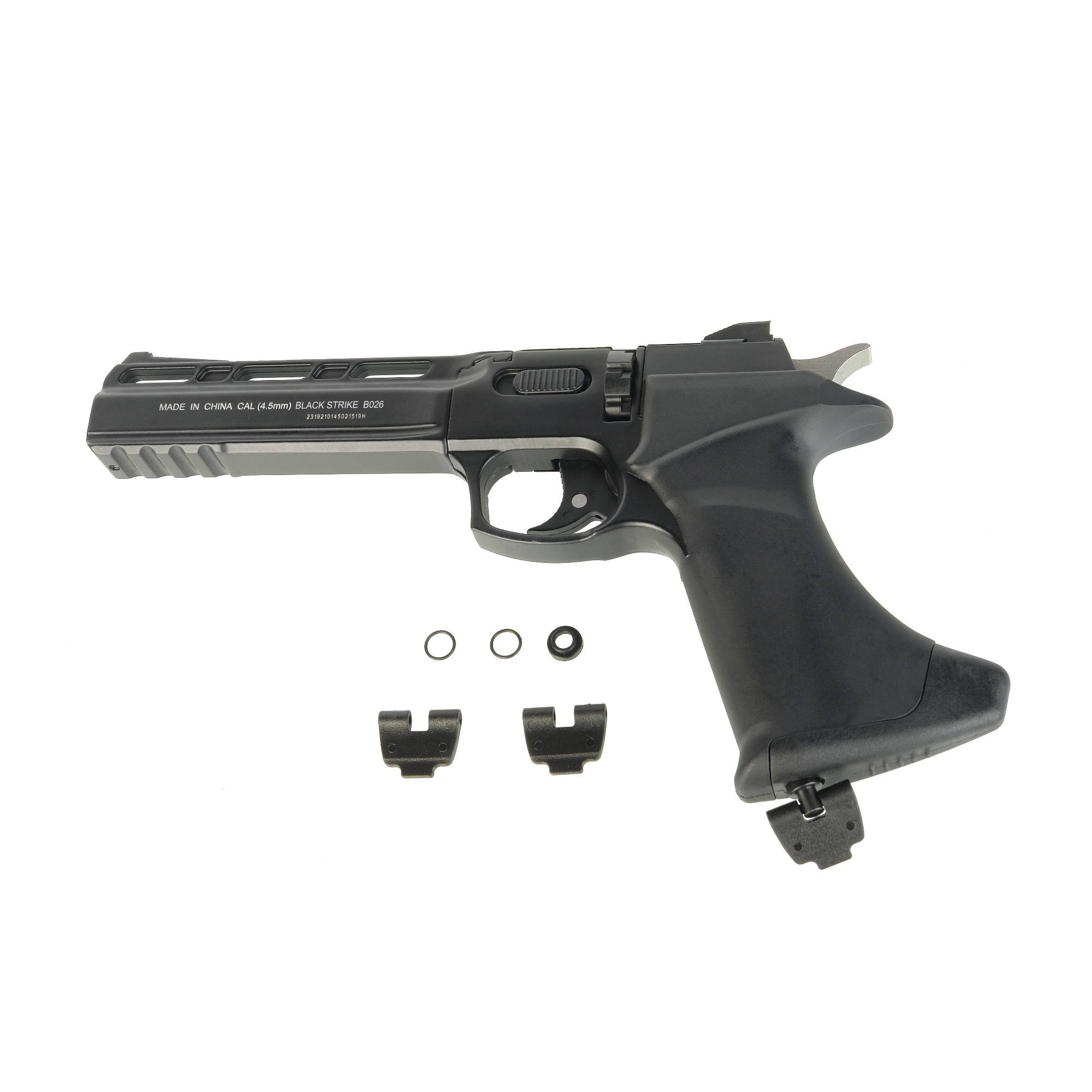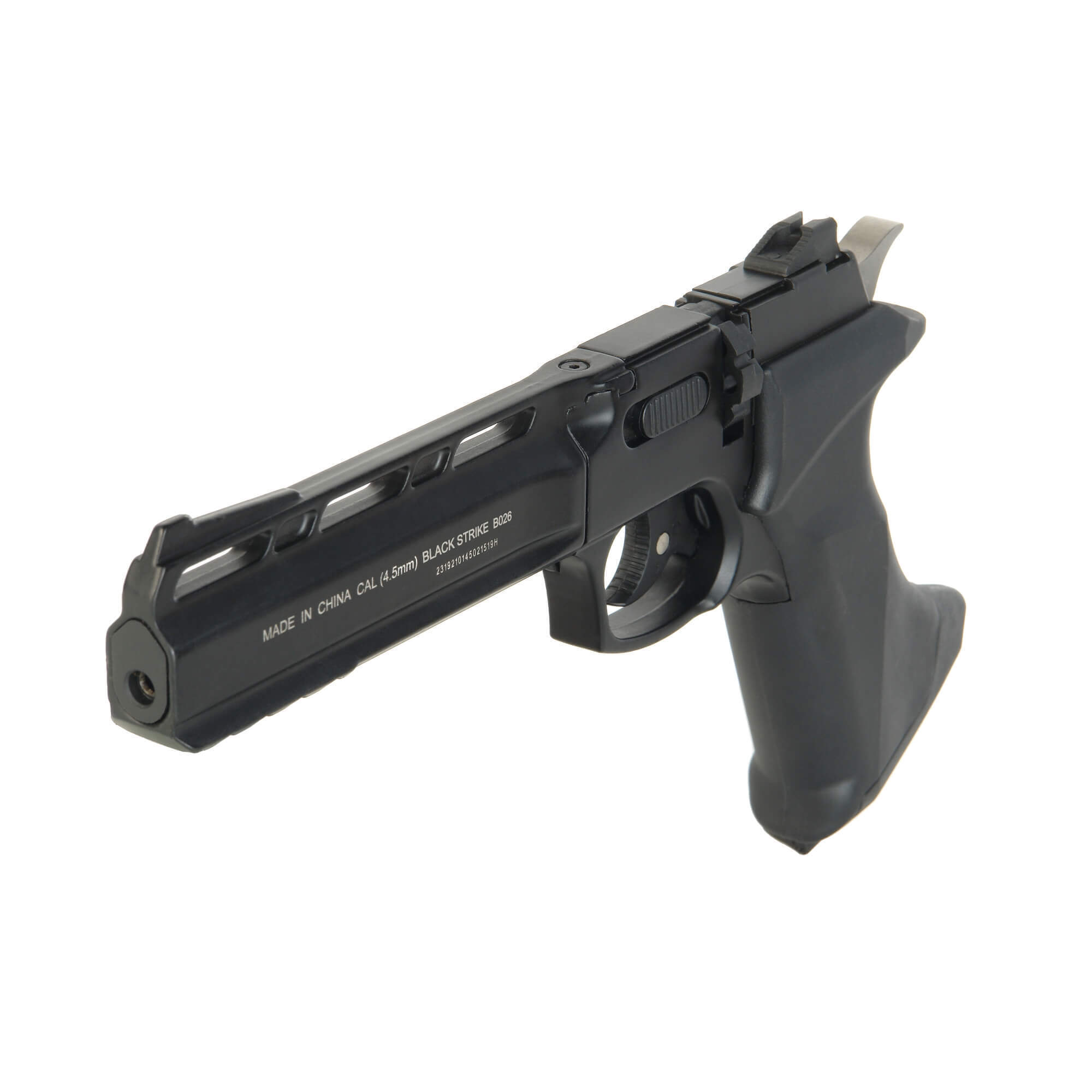 BLACK STRIKE «В026» – газобаллонный пневматический пистолет револьверного типа с барабаном. Предназначен для любительской стрельбы в тире, а также за городом в местах, отвечающих всем нормам безопасности.