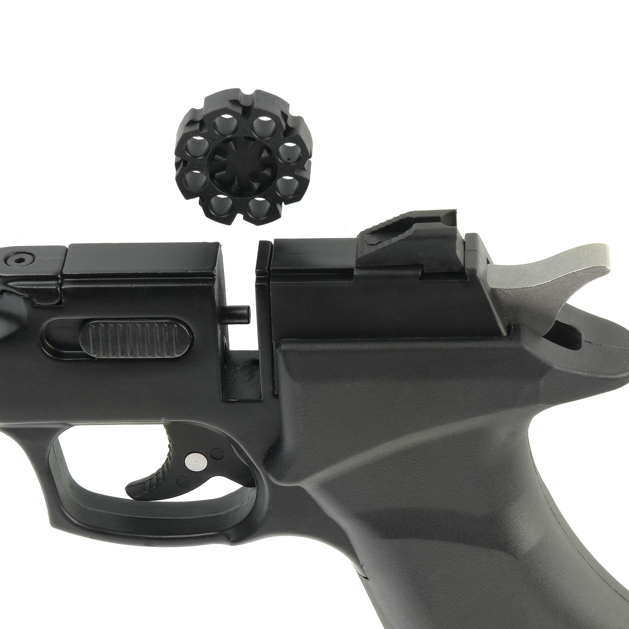 Барабан рассчитан на 8 пуль. Самовзводный ударно-спусковой механизм приводится в действие углекислым газом: используются баллоны СО2 на 12 г. Одного баллона хватает на 30 выстрелов. Гнездо для баллона находится в рукоятке.