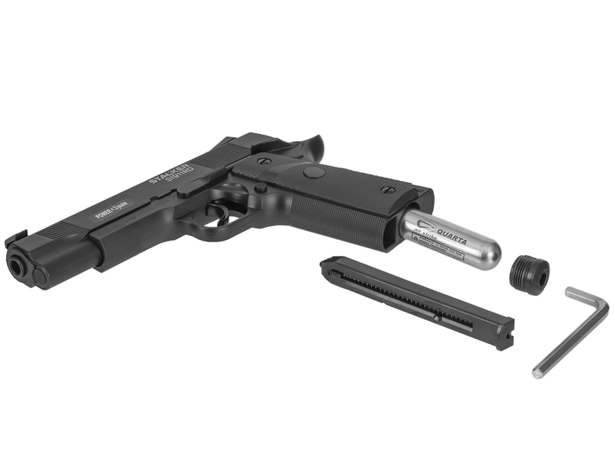 Stalker S1911RD стреляет металлическими шариками диаметром 4.5 мм, а в качестве источника энергии используется стандартный 12-ти граммовый баллон СО2 12 г., расположенный в рукояти.