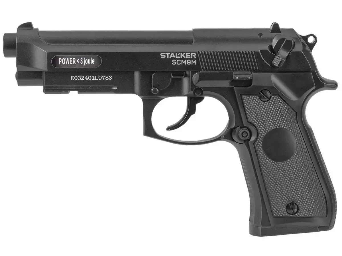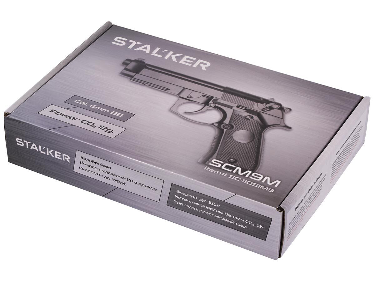 Пневматический пистолет Stalker SCM9M, входящий в страйкбольную серию AIRSOFT, создан на основе итальянского пистолета Beretta M9, разработанного для армии США. Это достаточно тяжёлый полноразмерный пистолет, своими массо-габаритными характеристиками и внешним видом похожий на боевой прототип. Имеет дульную энергию менее 3 Джоулей, поэтому не является оружием, что позволяет приобретать его без каких-либо лицензий и разрешений.