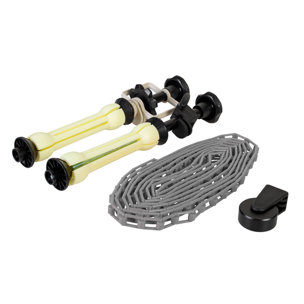 Цепь состоит из разъемных звеньев. Ее длина от зубчатого колеса до груза – 2 метра. Убрав часть звеньев, цепь можно укоротить, чтобы сделать управление фоном более удобным. Грузик (280 г.) с направляющими для звеньев утяжеляет цепь, чтобы она висела ровно, не раскачивалась и не запутывалась.
