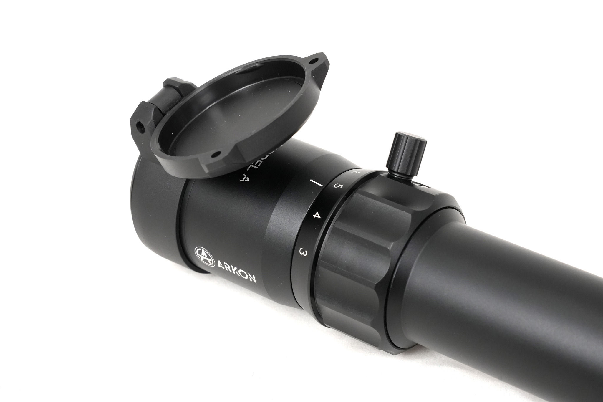 Баллистическая прицельная сетка расположена в первой фокальной плоскости (FFP), что обеспечивает постоянные угловые размеры между элементами при любом увеличении. Это позволяет вести огонь выносом, определять дистанцию до цели по ее габаритам и оценивать скорость движения. Сетка нанесена на линзу методом лазерной гравировки. Многоуровневая подсветка гарантирует отличную видимость на мишени при любом уровне внешнего освещения. Параллакс настраивается с помощью бокового барабана.