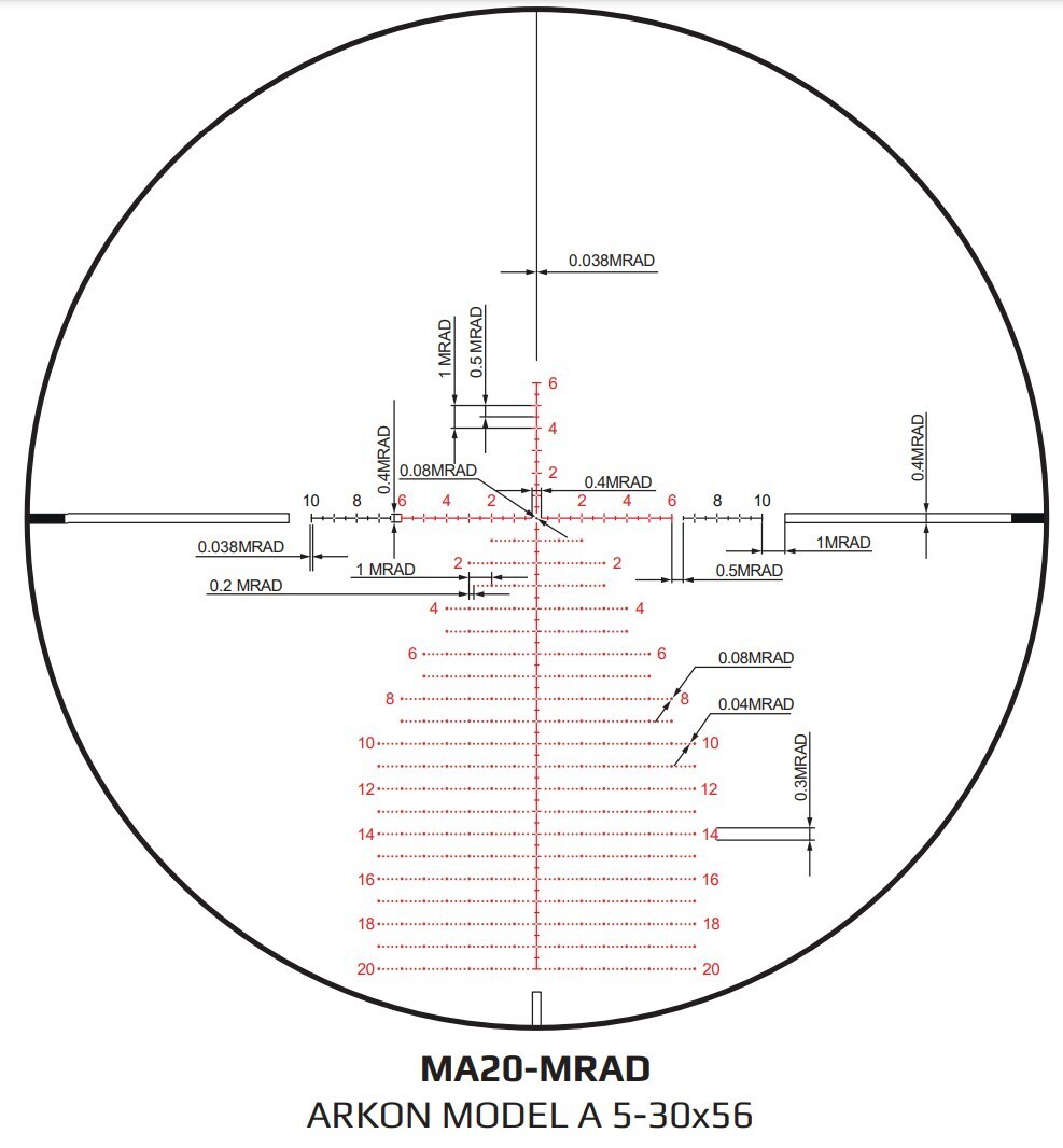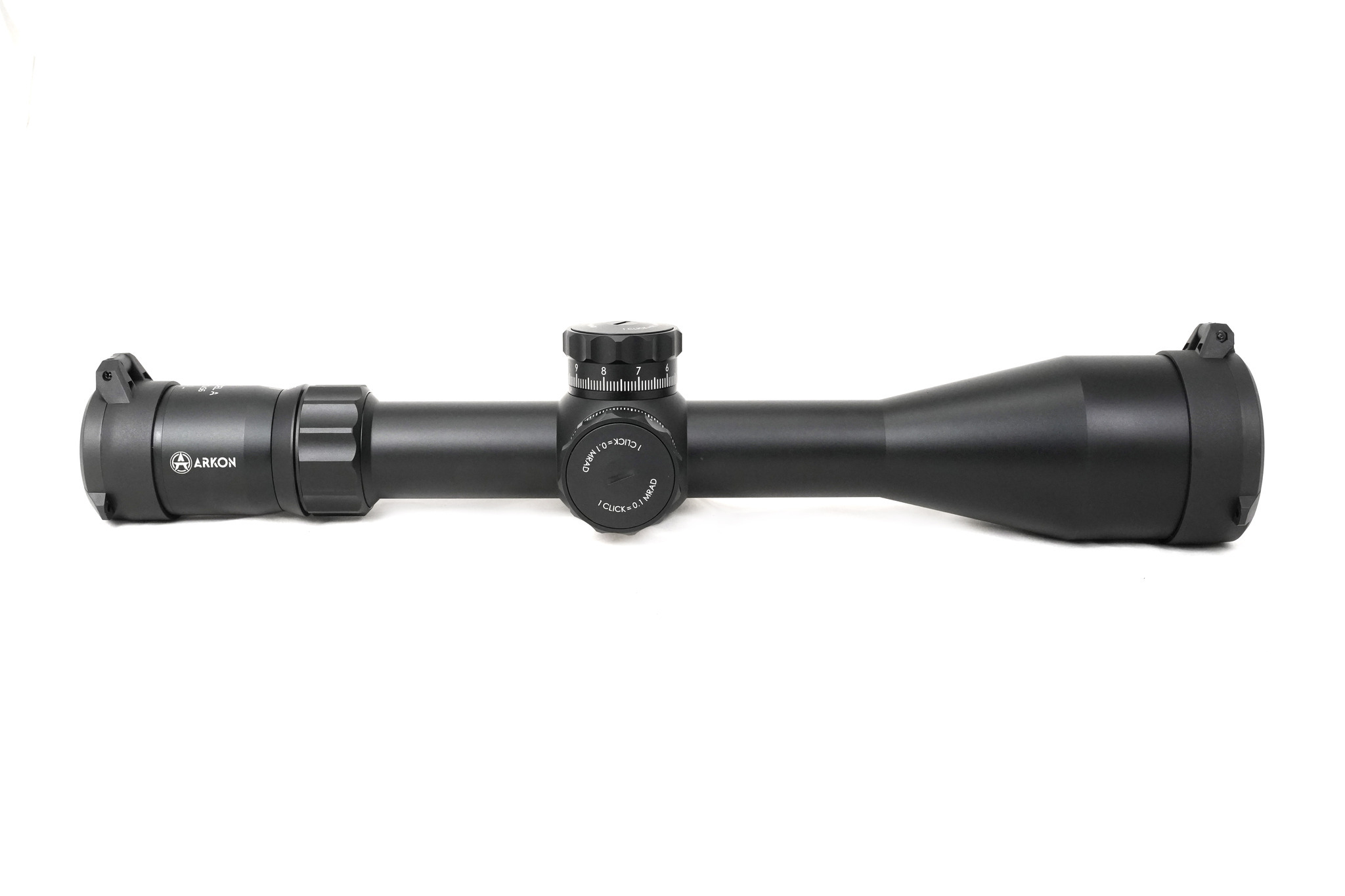 Arkon Model A 5-30x56 оснащен тактическими барабанами ввода поправок с функциями быстрого сброса настроек и установки нового нуля. Цена клика составляет 0,1 MRAD. К услугам стрелков внушительный запас хода на дальность и ветер - 23 MRAD. Сверхточная и надежная механика обеспечивает идеальную повторяемость.