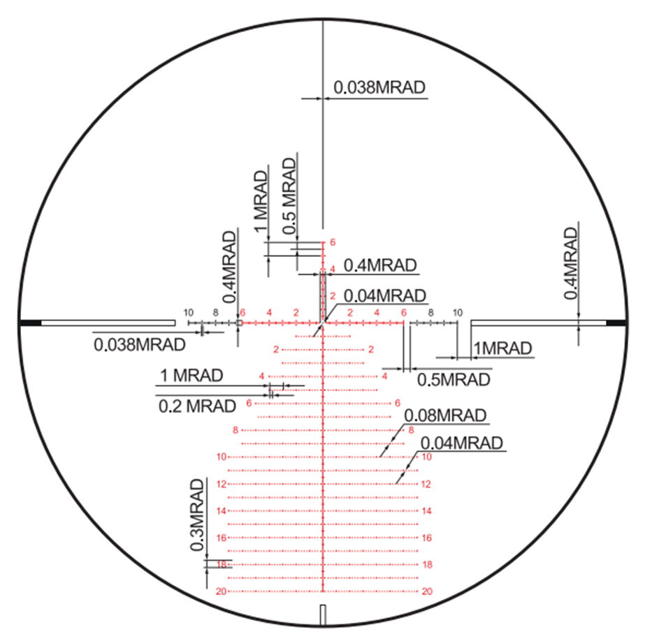 Баллистическая сетка MA20-MRAD с расширенной разметкой находится в первой фокальной плоскости (FFP), что гарантирует постоянство угловых расстояний при любом увеличении. Стрелок может выполнять корректный вынос точки прицеливания, определять дистанцию до цели по ее габаритам и оценивать скорость. В отличие от проволочных аналогов, лазерная гравировка сетки обеспечивает высокую четкость и надежность. Многоуровневая подсветка делает сетку хорошо заметной при разном освещении. Питание системы подсветки — батарея CR2032. Отстройка параллакса производится боковым барабаном.